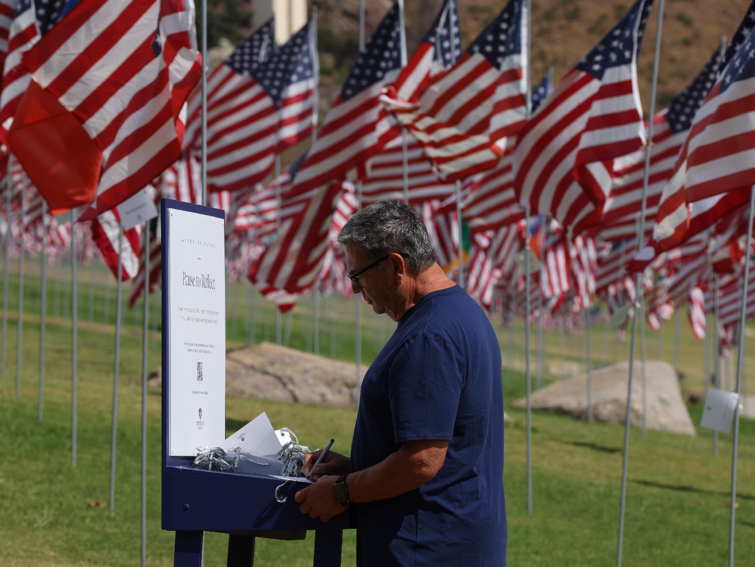 9月10日,在美国加利福尼亚州洛杉矶县马利布,一名男子在佩珀代因大学草坪上的“旗海”中填写留言卡片。