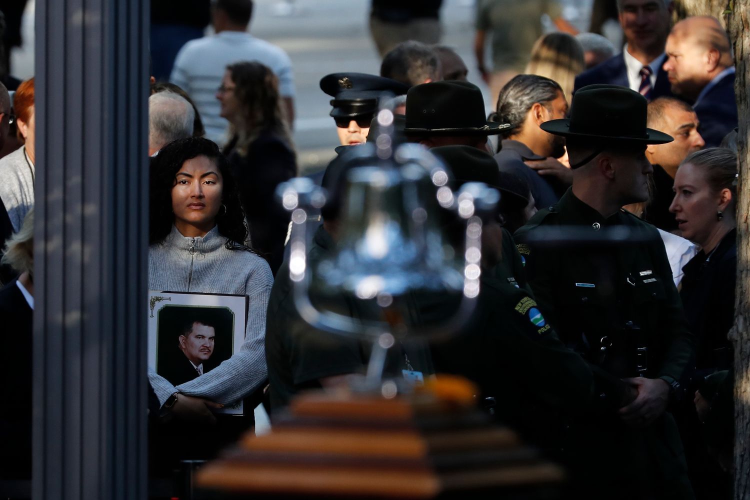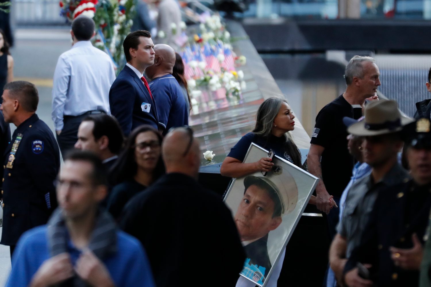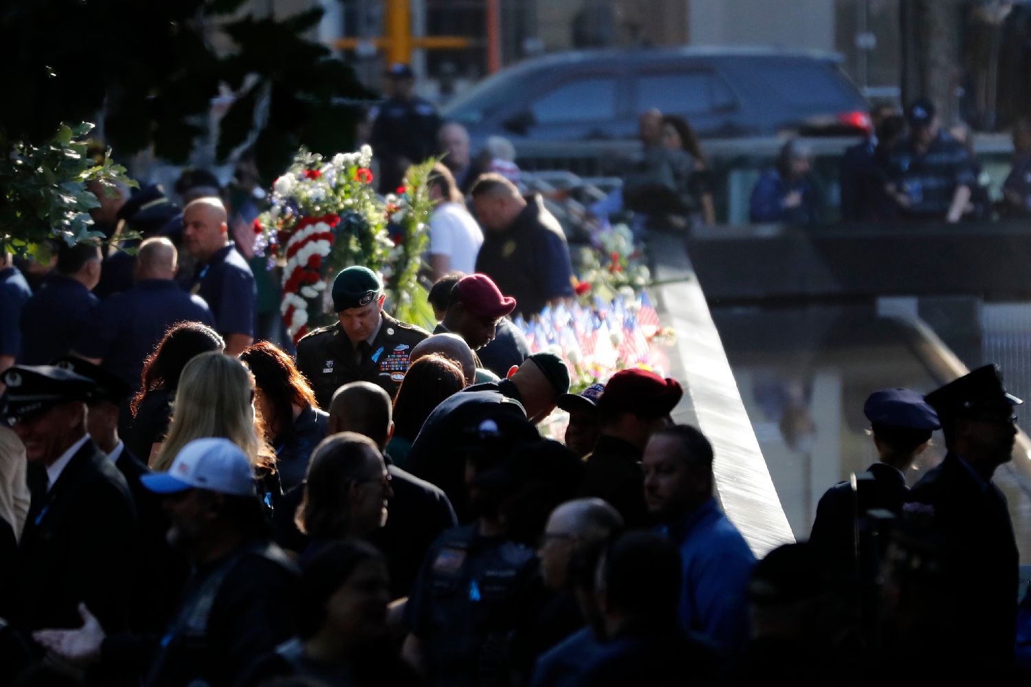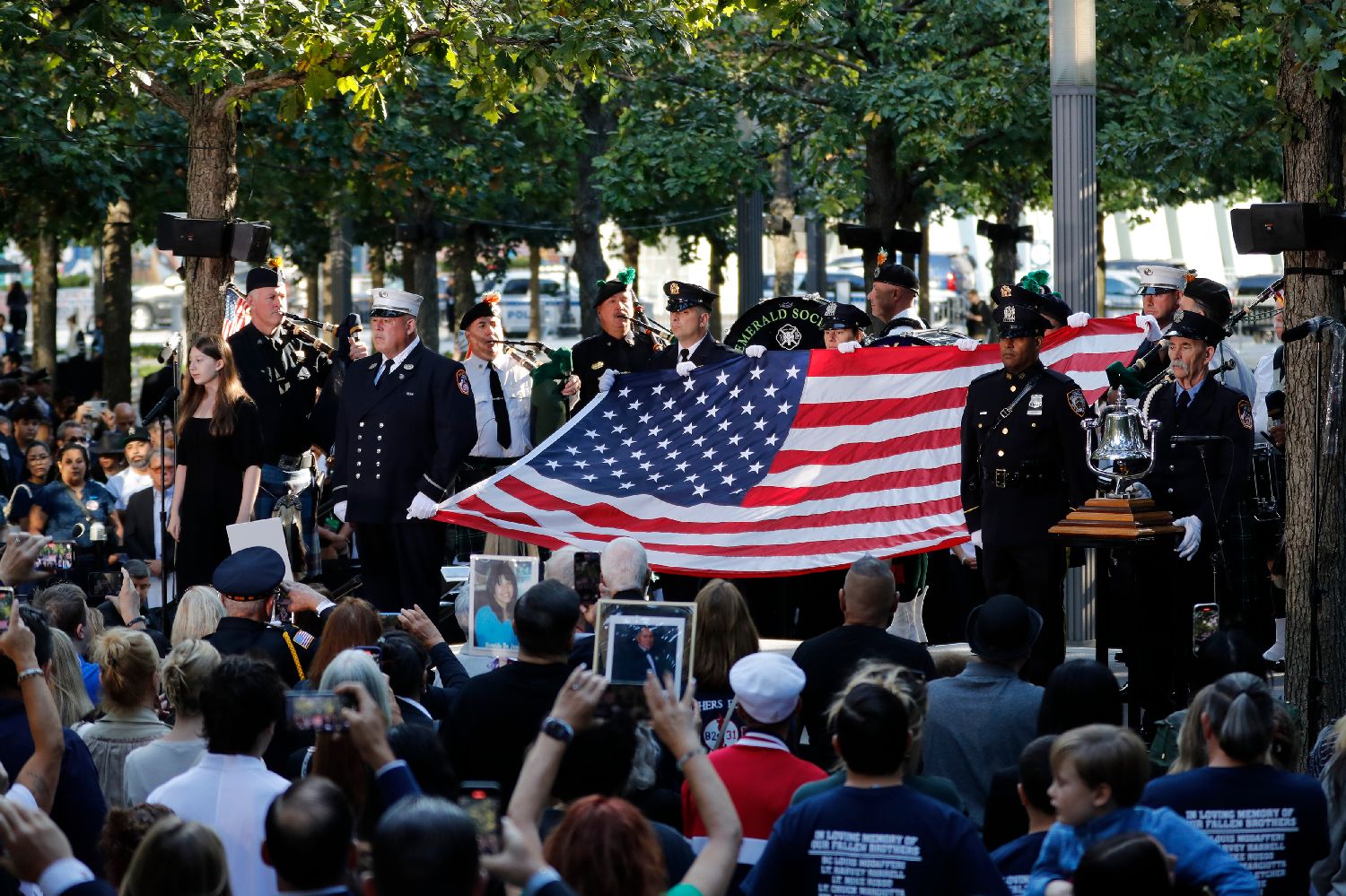 当天上午8点40分许,由纽约市警察、消防员等组成的仪仗队高举美国国旗走上讲台,一名17岁高中生唱响美国国歌,纪念仪式正式开始。8点46分,悼念的钟声响起,全场默哀。随后,遇难者亲属代表登台,依次念出所有遇难者姓名。