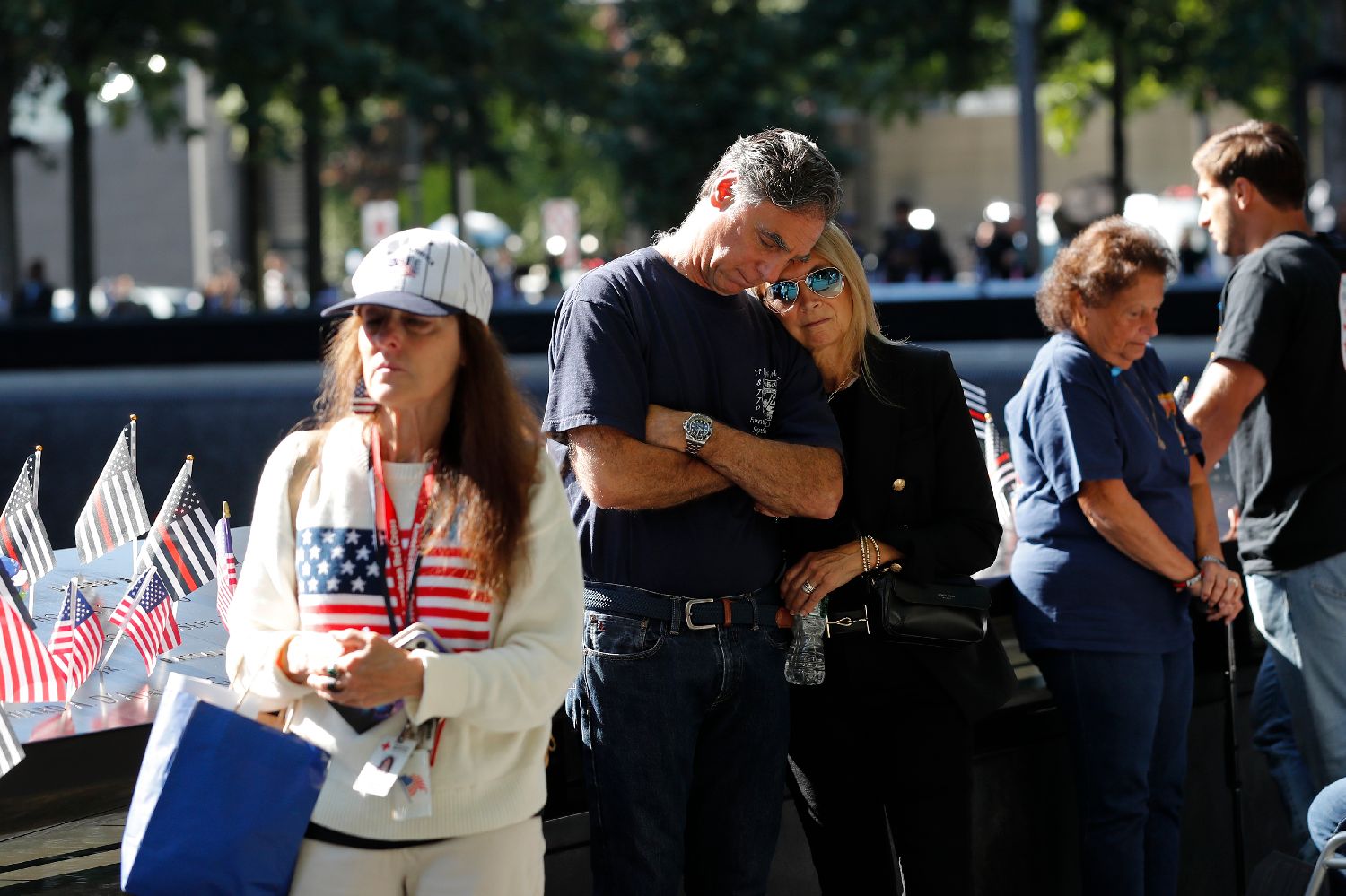 9月11日,数千人聚集在美国纽约世贸中心遗址广场,悼念24年前“9·11”恐怖袭击事件中的遇难者。