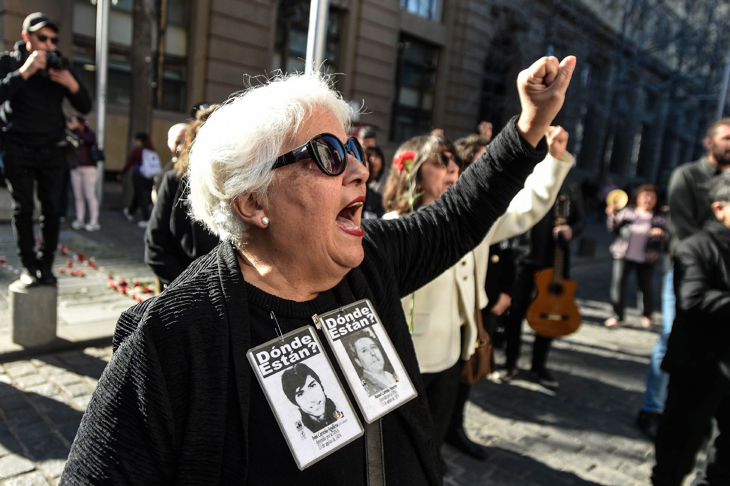 9月11日,智利民众佩戴受害者照片在首都圣地亚哥的总统府莫内达宫附近参加活动,悼念前总统阿连德和军政府统治时期的受害者。(图片来源:本文图片均据新华社)