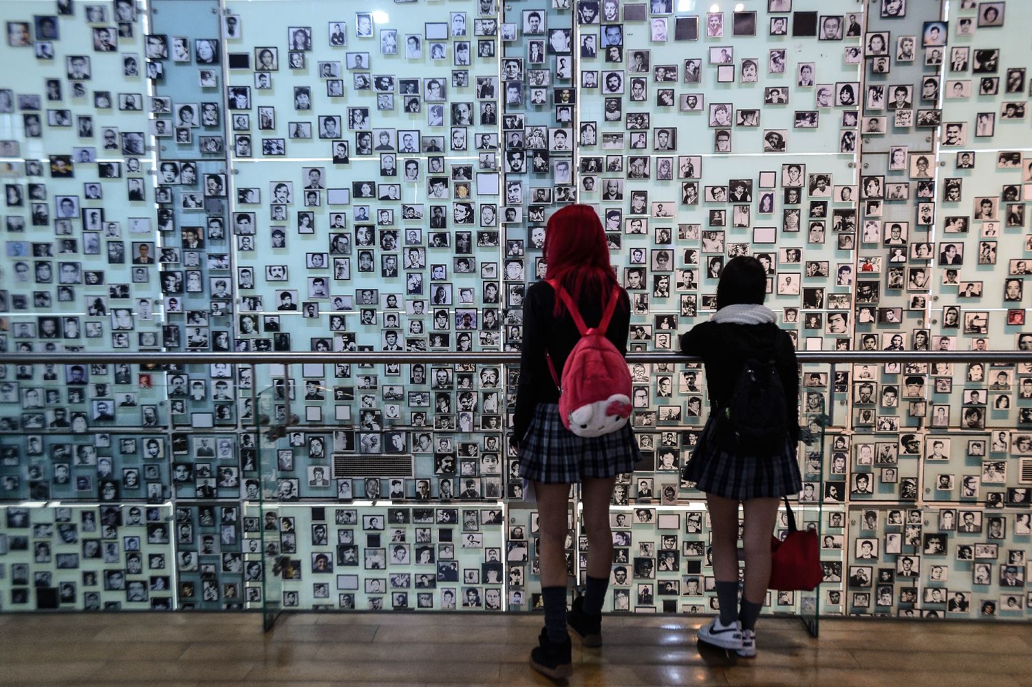 9月11日,智利民众在首都圣地亚哥参观纪念展览,观看墙面上贴满的受害者照片。