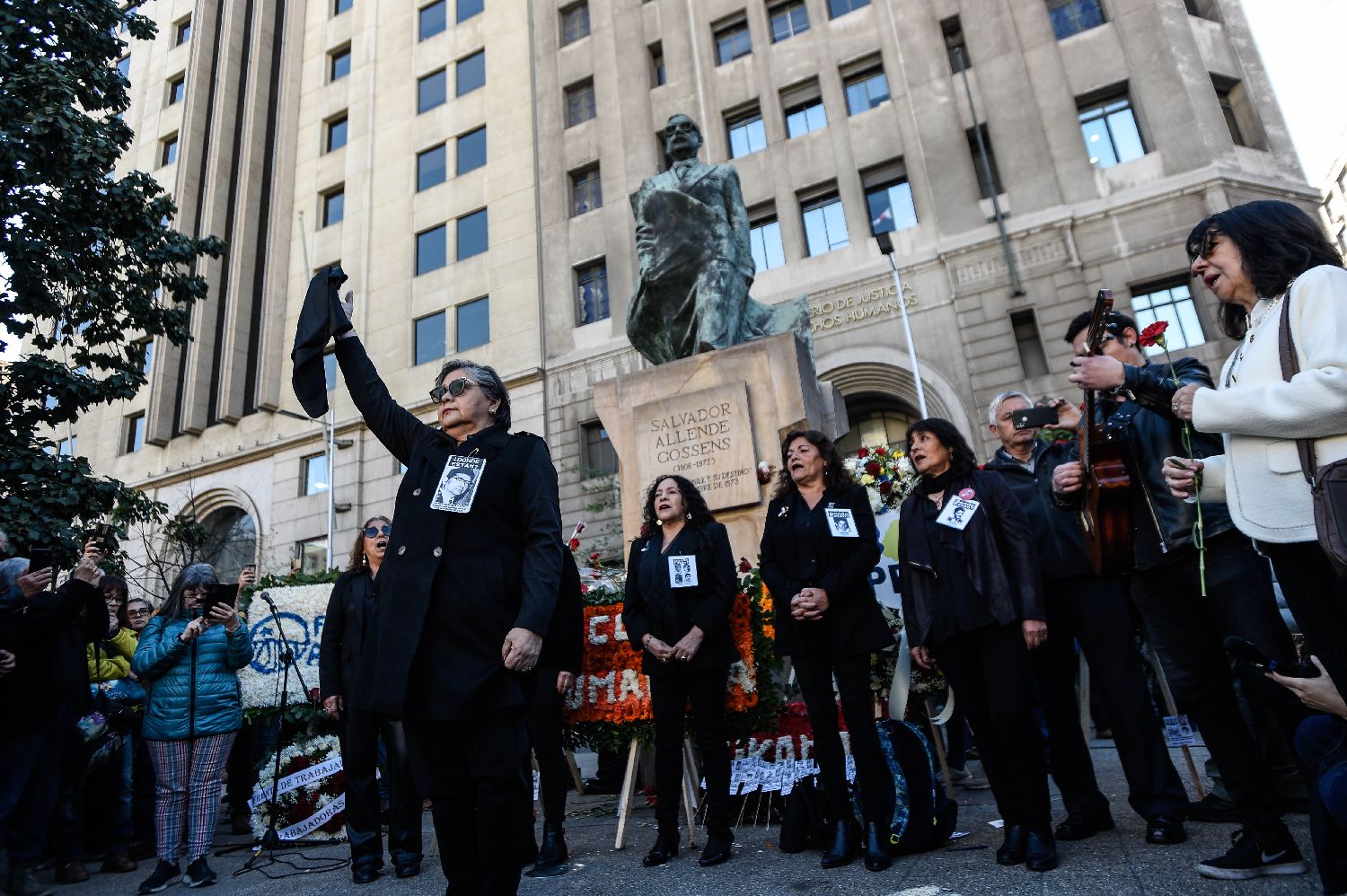 9月11日,智利民众在首都圣地亚哥的总统府莫内达宫附近阿连德总统雕像前举行活动,悼念前总统阿连德和军政府统治时期的受害者。