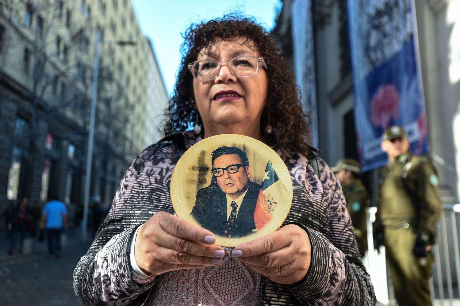 9月11日,一名妇女手举阿连德总统像在智利首都圣地亚哥的总统府莫内达宫附近参加活动,悼念前总统阿连德和军政府统治时期的受害者。