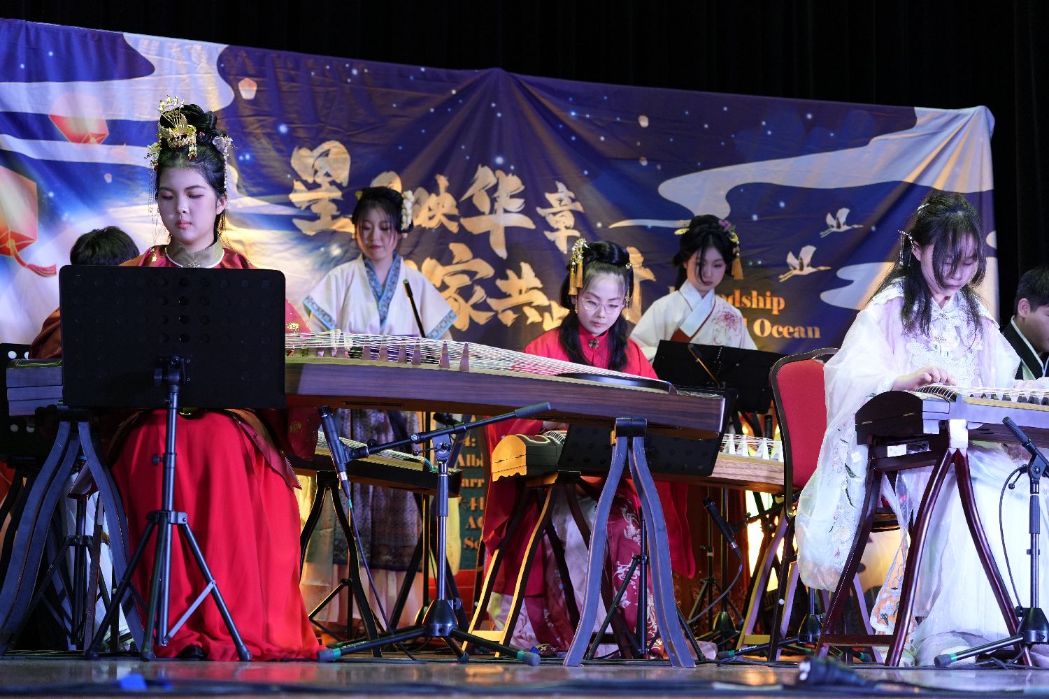 图为中国留学生在晚会上表演古筝合奏。(图片来源:本文图片均来自新华社)