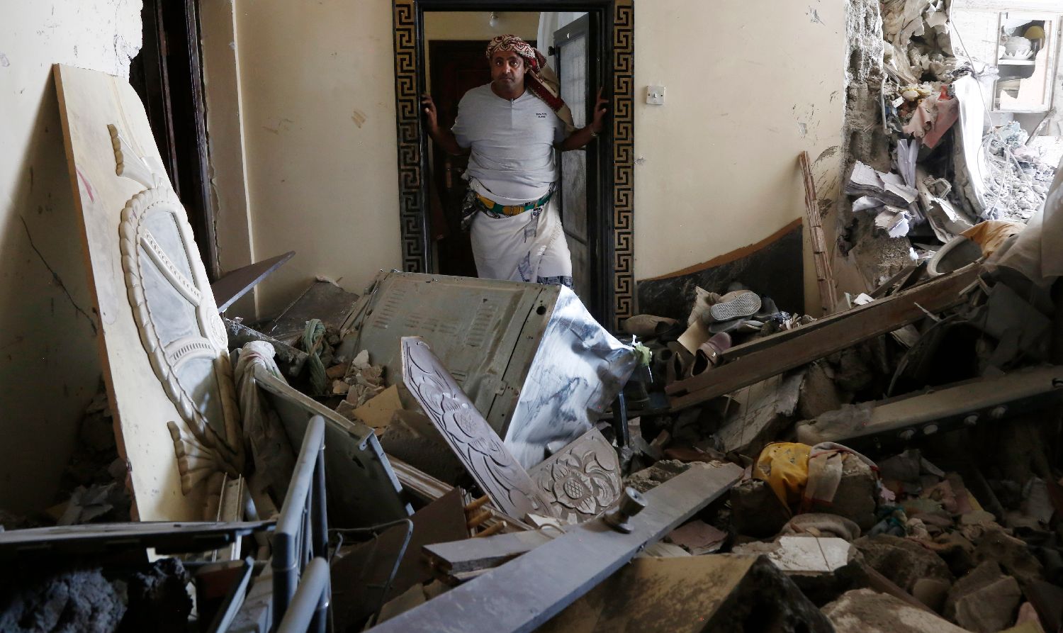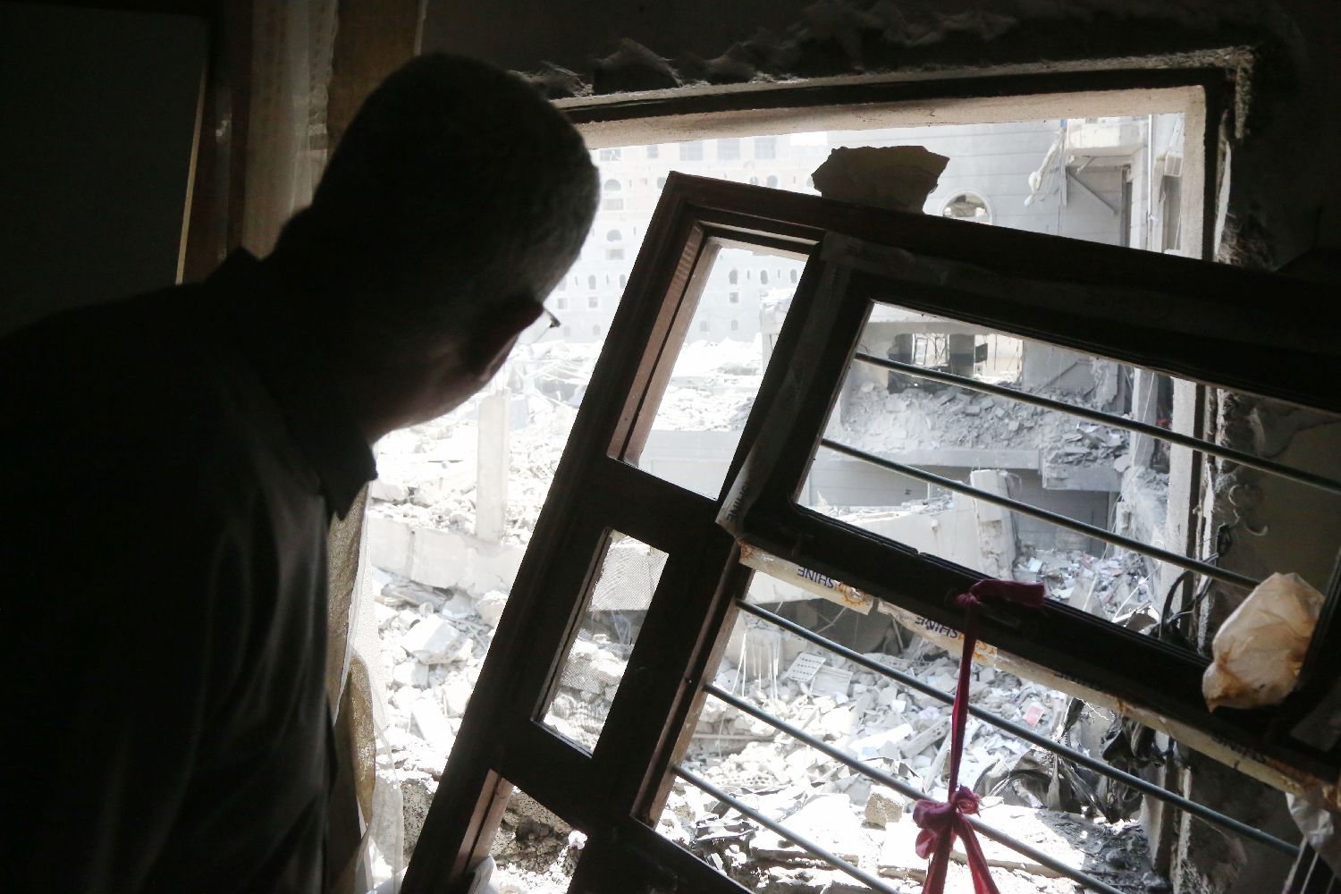 9月13日,在也门首都萨那,一名男子查看遭以军空袭损毁的自家住宅。
