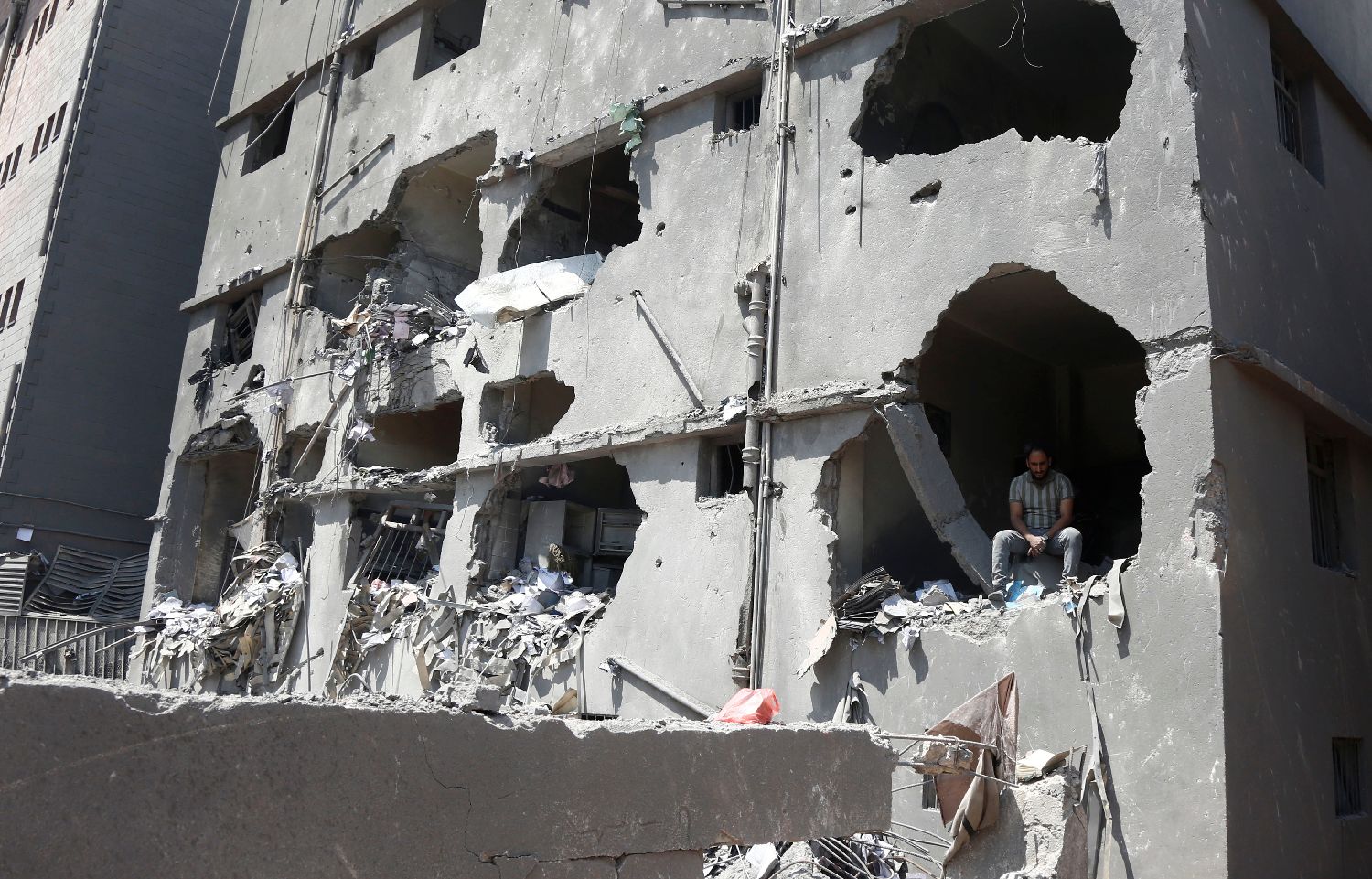 9月13日,在也门首都萨那,一名男子坐在遭以军空袭损毁的自家住宅废墟中。