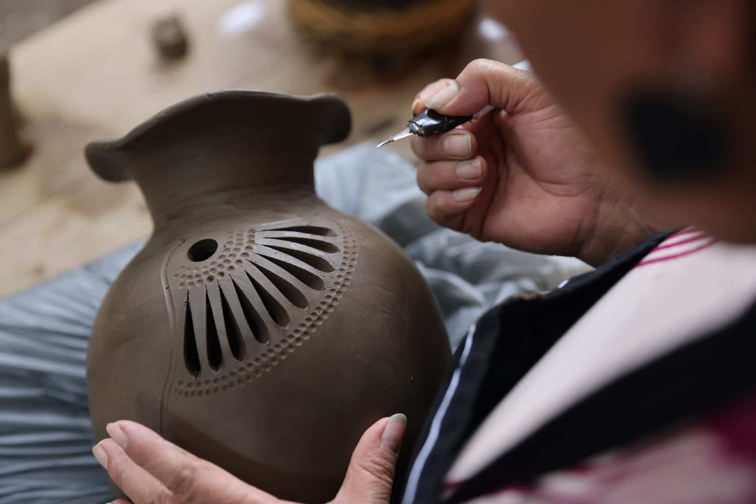 9月14日,在墨西哥瓦哈卡州的圣巴托洛科约特佩克市,一名黑陶手工艺者进行雕刻镂空。(图片来源:本文图片均据新华社)