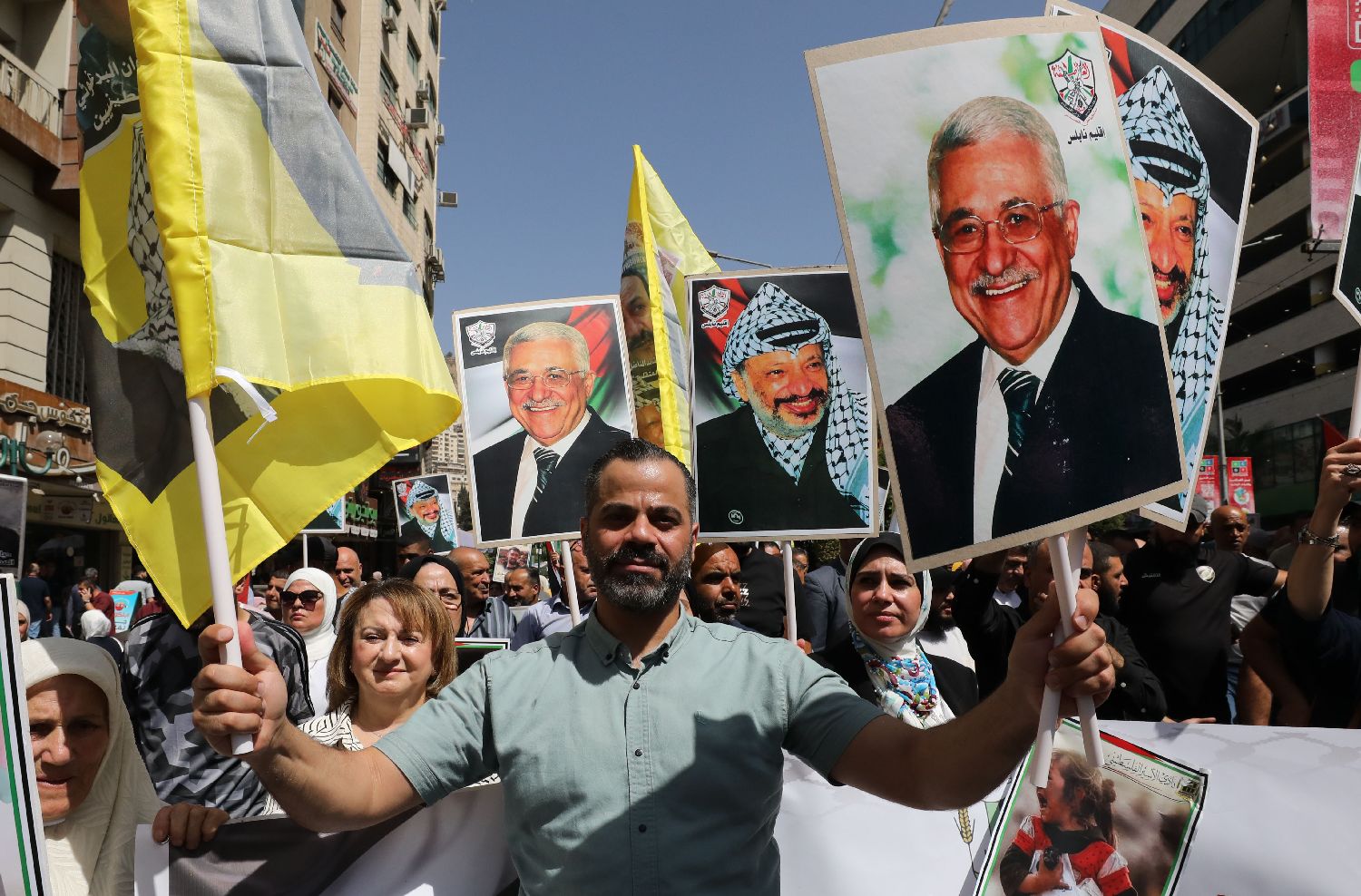 23日,在约旦河西岸城市纳布卢斯,民众挥舞巴勒斯坦领导人阿拉法特和阿巴斯画像参加庆祝活动。