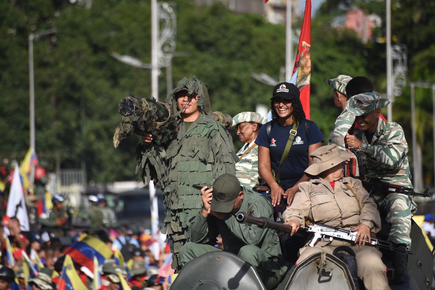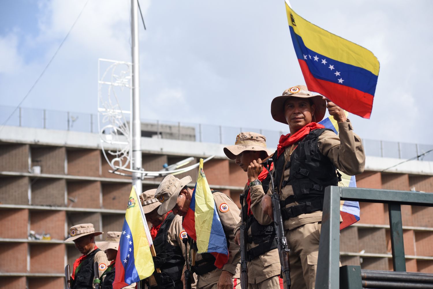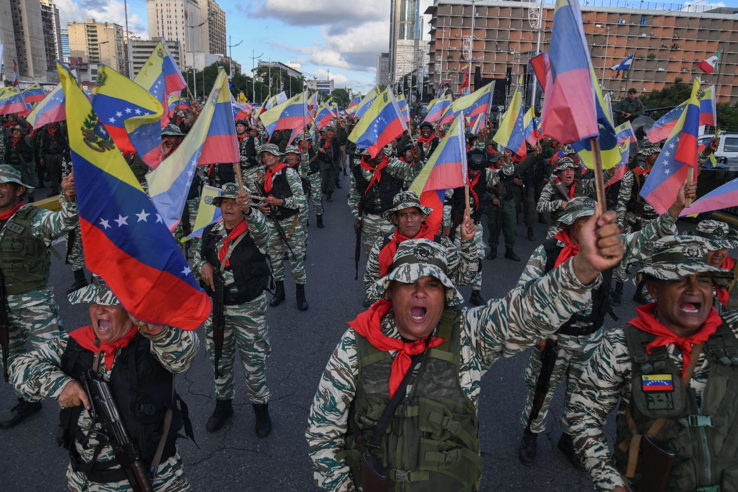 9月23日,在委内瑞拉首都加拉加斯,玻利瓦尔民兵组织成员携带武器参加游行。