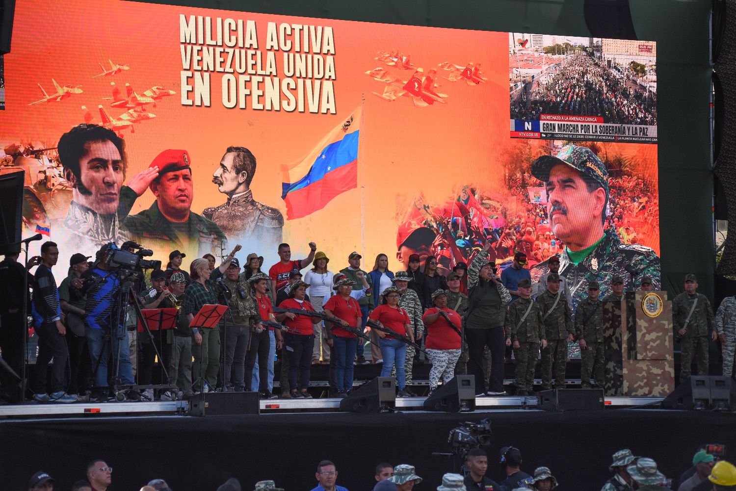 9月23日,在委内瑞拉首都加拉加斯,玻利瓦尔民兵组织成员携带武器、挥舞委内瑞拉国旗参加游行。