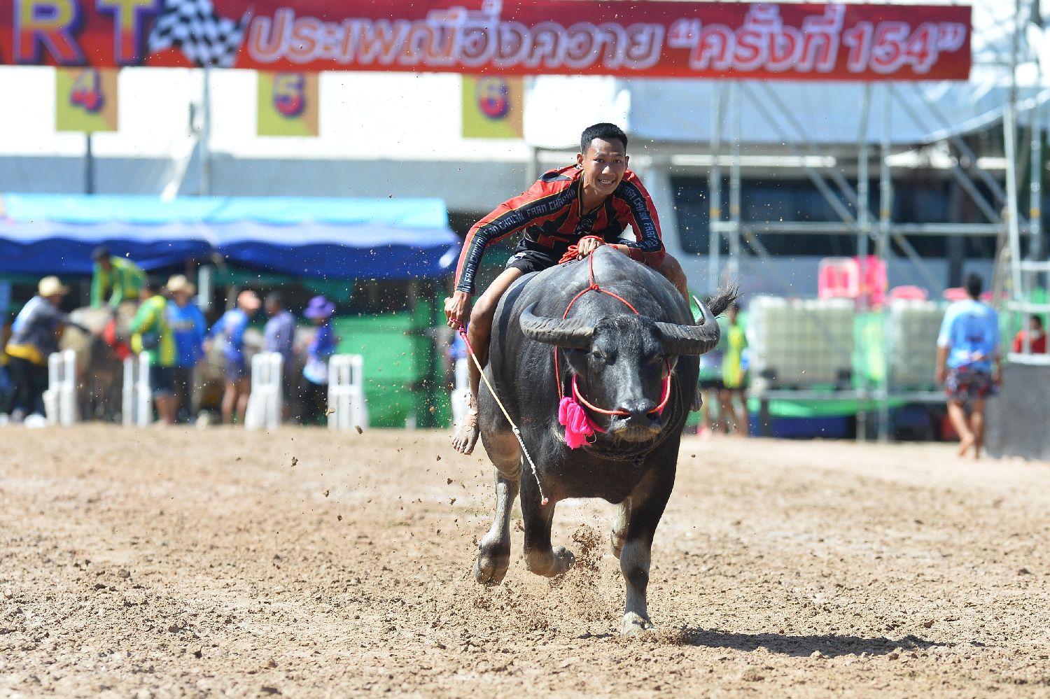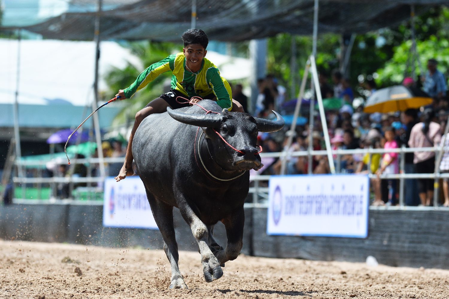 10月6日,一名男子在泰国春武里府参加骑水牛大赛。(图片来源:本文图片均据新华社)