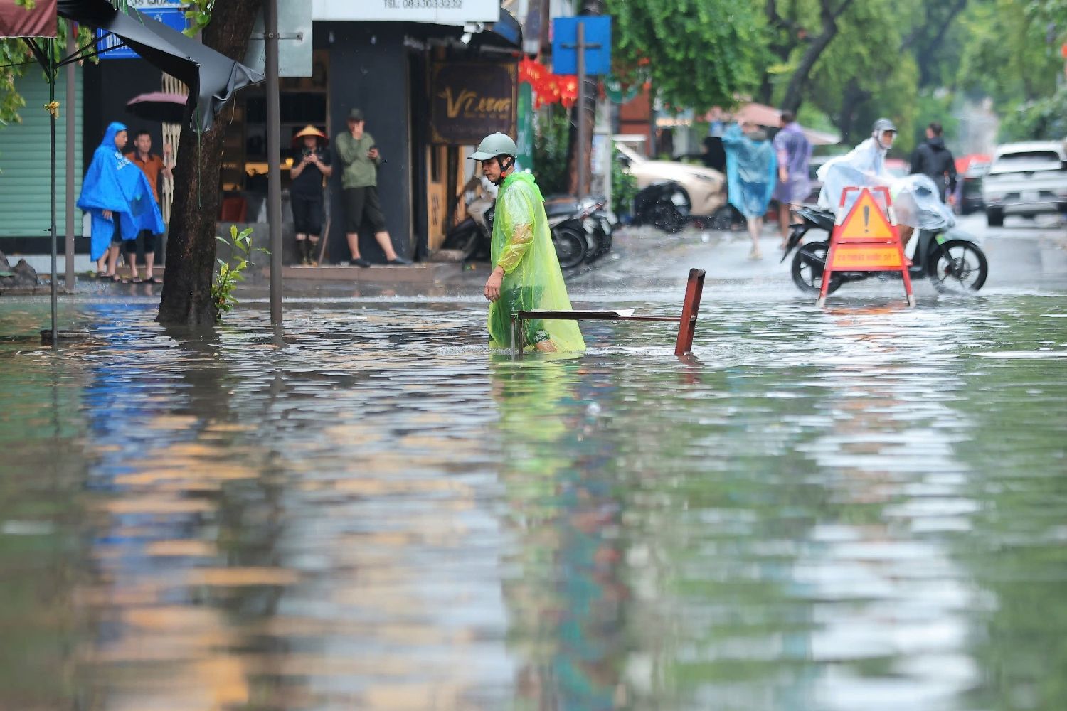 10月7日,在越南首都河内,人们在被洪水淹没的街道上涉水出行。