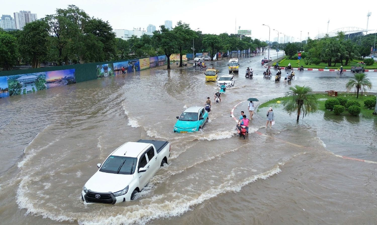 10月7日,在越南首都河内,车辆在被洪水淹没的街道上涉水前行。