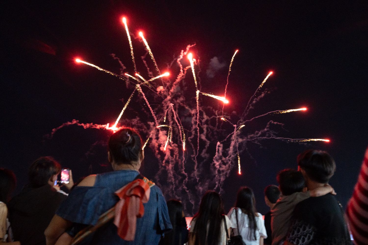 10月7日晚,人们在老挝首都万象湄公河畔观看烟花。(图片来源:本文图片均据新华社)