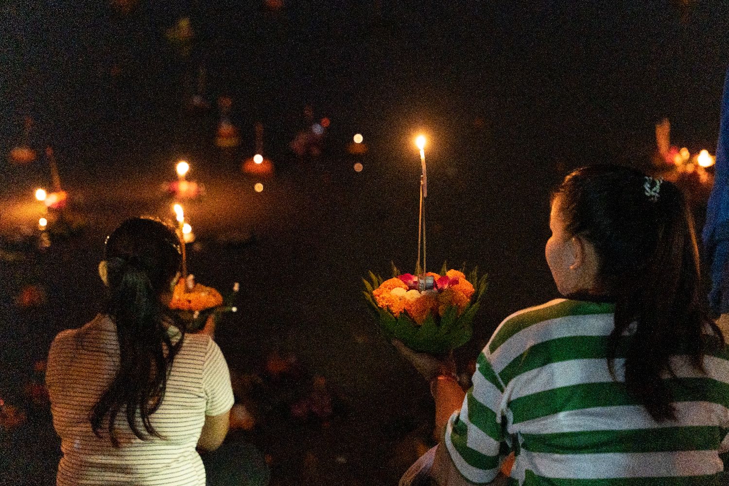 10月7日晚,在老挝万象湄公河畔,人们将水灯放入河中祈福。
