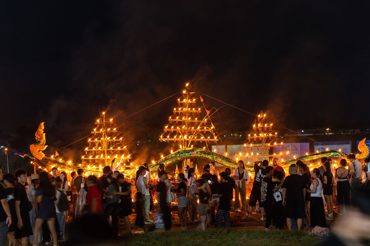 10月7日晚,人们在老挝首都万象观看龙舟花灯并合影留念。