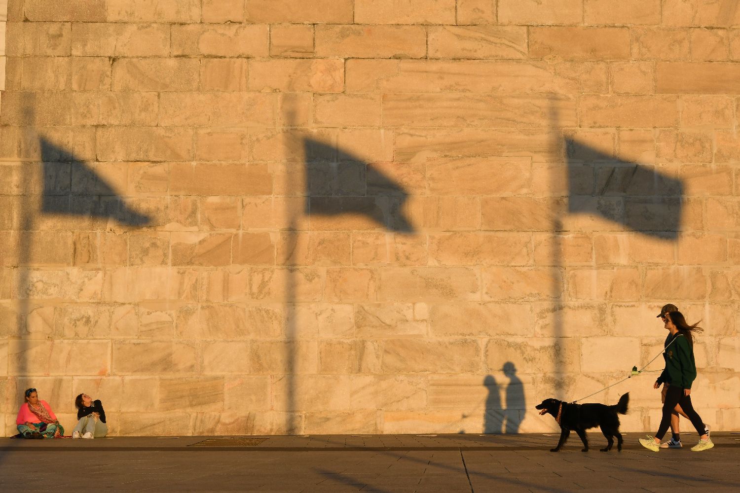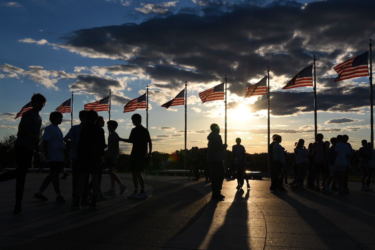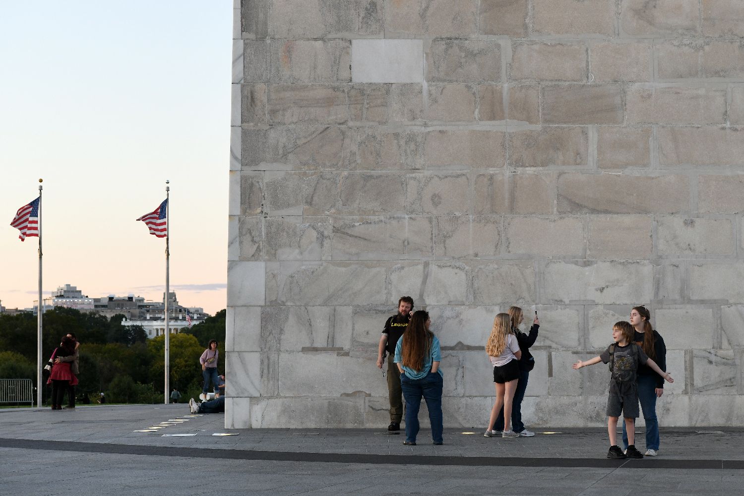 10月8日,在美国华盛顿,民众在华盛顿纪念碑前休闲。