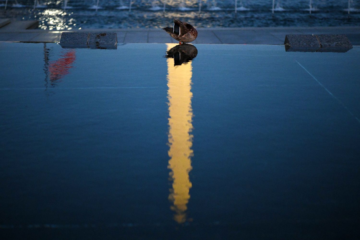 10月8日,在美国华盛顿,一只鸭子在华盛顿纪念碑水中倒影上休憩。