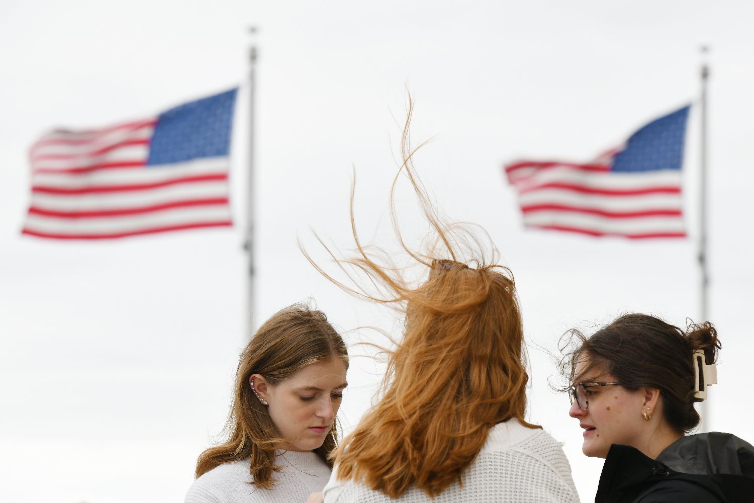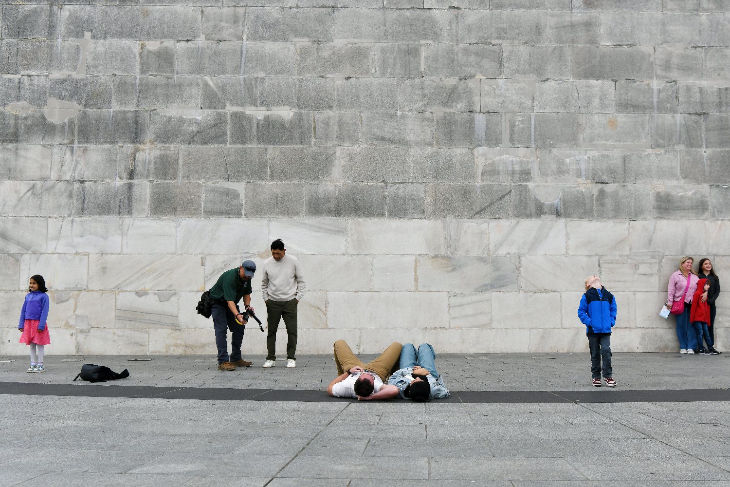 10月12日,在美国华盛顿,民众在华盛顿纪念碑前休闲。