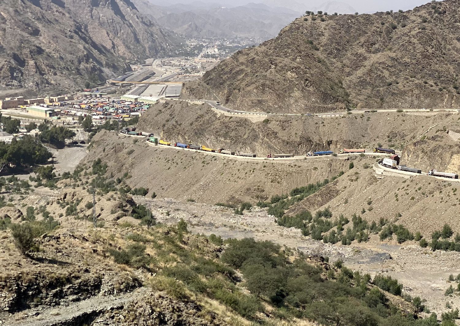 10月13日,在巴基斯坦与阿富汗的边境口岸多尔哈姆,卡车因边境地区冲突而滞留。