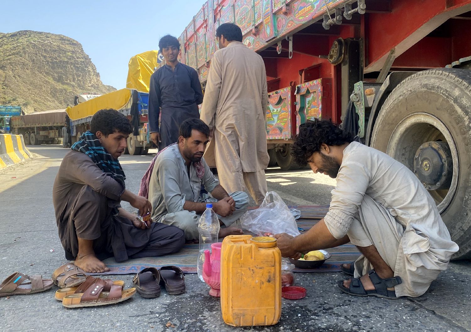 10月13日,在巴基斯坦与阿富汗的边境口岸多尔哈姆,卡车司机在车辆拥堵的公路上吃东西。