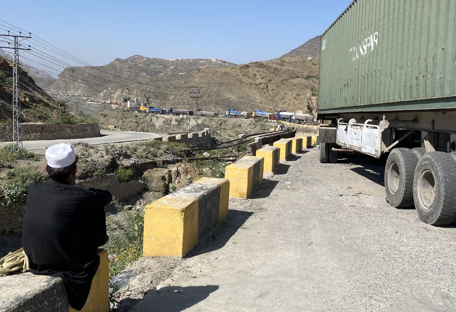 10月13日,在巴基斯坦与阿富汗的边境口岸多尔哈姆,卡车因边境地区冲突而滞留。(图片来源:本文图片均据新华社)