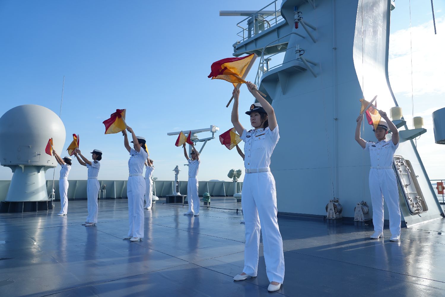 10月16日,戚继光舰官兵在指定海域向泰国“象岛”号登陆舰展示旗语。
