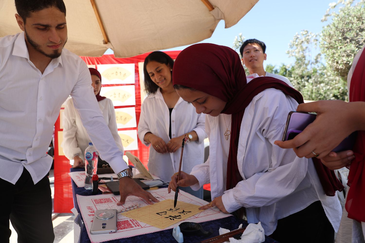 10月20日,在埃及开罗,学生在开罗巴德尔大学举办的中国文化节上体验书法。
