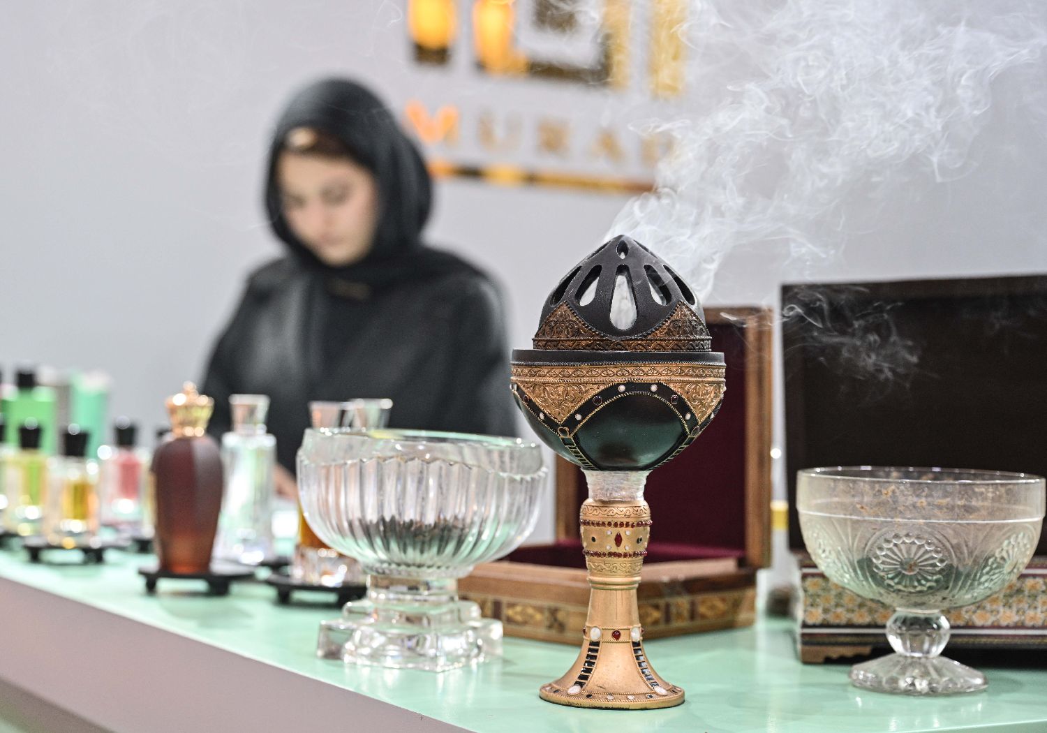 10月21日,在科威特哈瓦利省,一名女子在香水展上展示香炉。