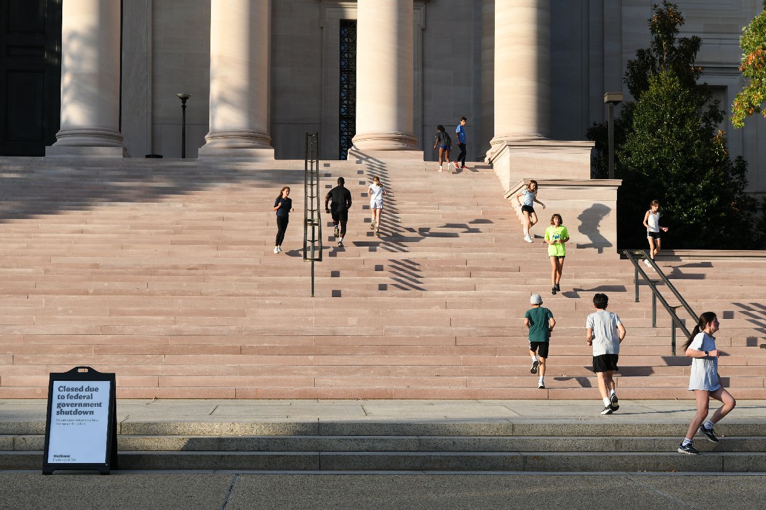 10月21日,在美国华盛顿,孩子们在因联邦政府“停摆”而关闭的美国国家美术馆前进行跑步训练。