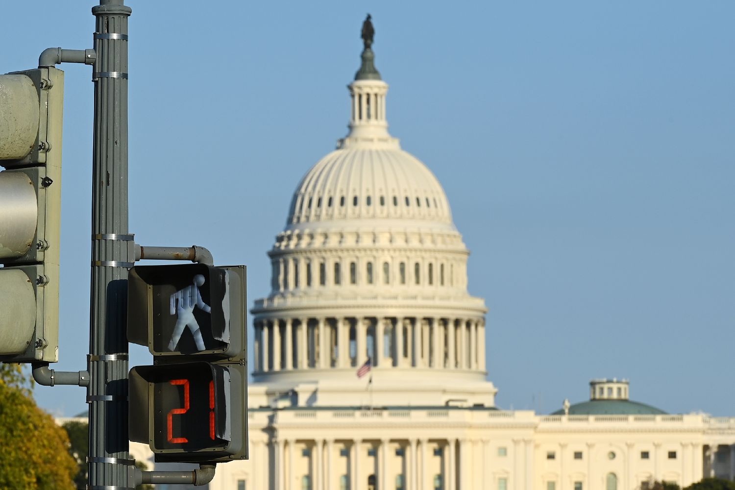 10月21日在美国华盛顿拍摄的国会大厦和交通信号灯。