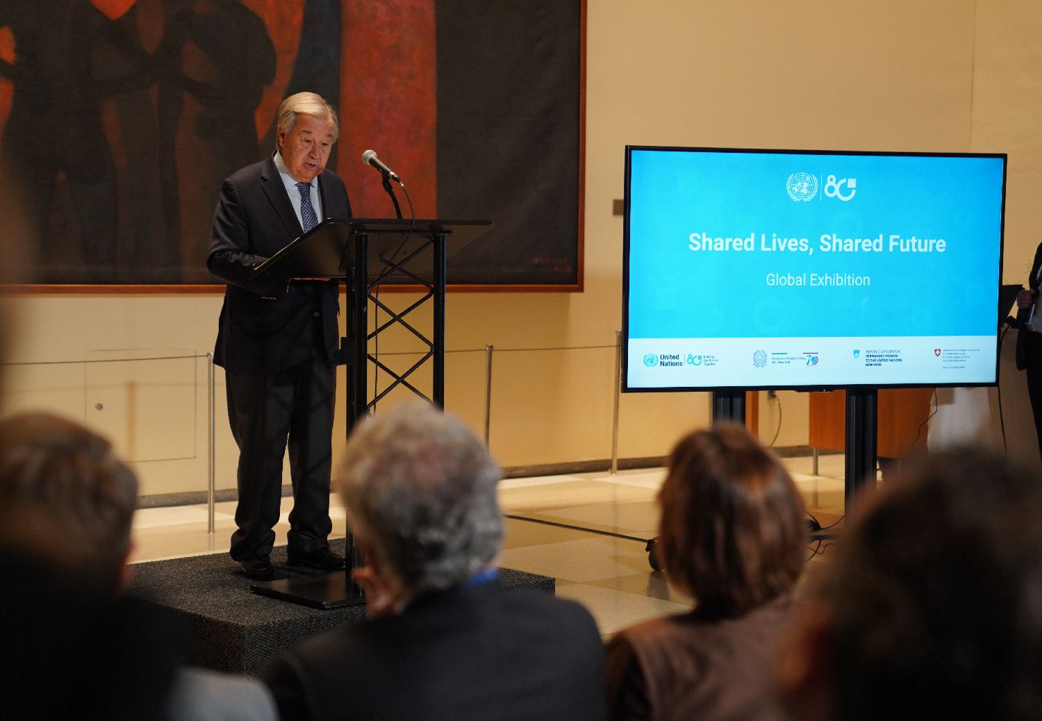 展览通过图片、视频等多媒体方式讲述联合国如何深刻影响全球各地普通人生活的故事。图为10月20日,在位于纽约的联合国总部,联合国秘书长古特雷斯在“共栖生命,共享未来”庆祝联合国成立80周年全球图片展启动仪式上致辞。(图片来源:本文图片均自新华社)