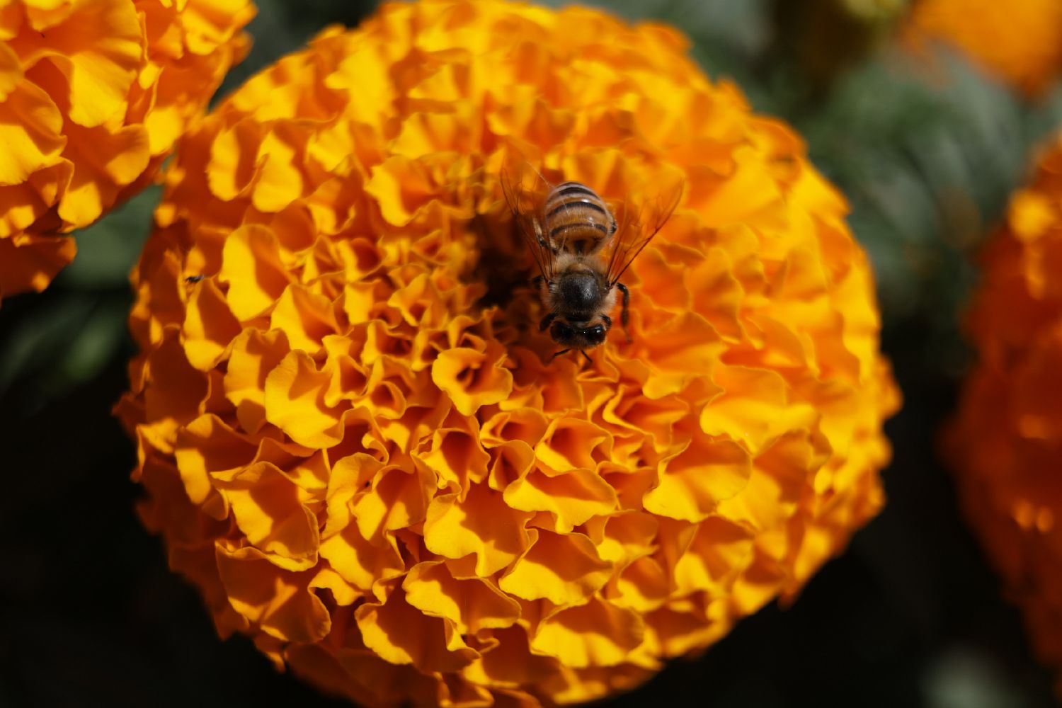 10月21日,在墨西哥首都墨西哥城,一只蜜蜂停留在万寿菊上。(图片来源:本文图片均据新华社)