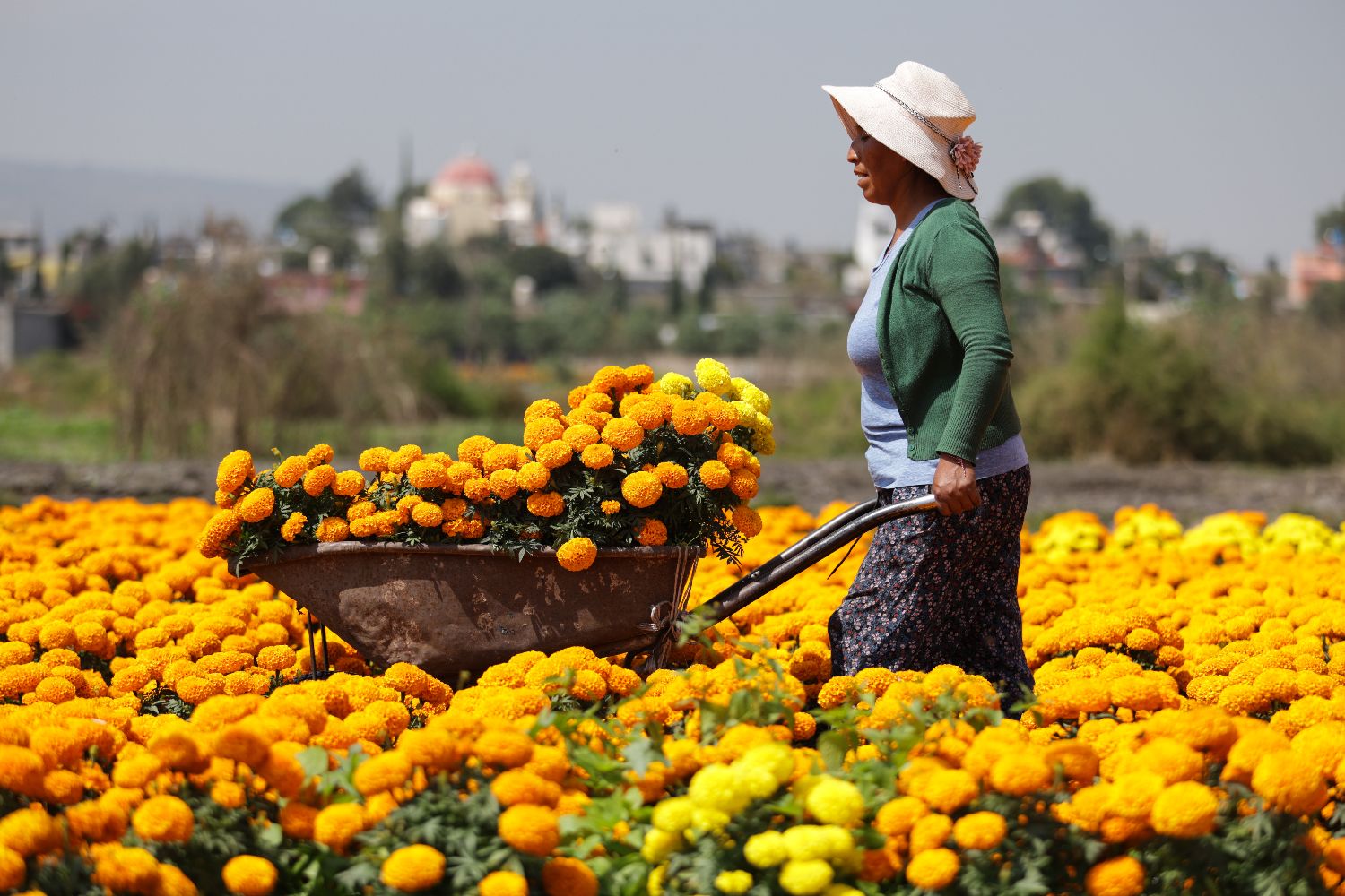 10月21日,在墨西哥首都墨西哥城,花农在田地间采收万寿菊。