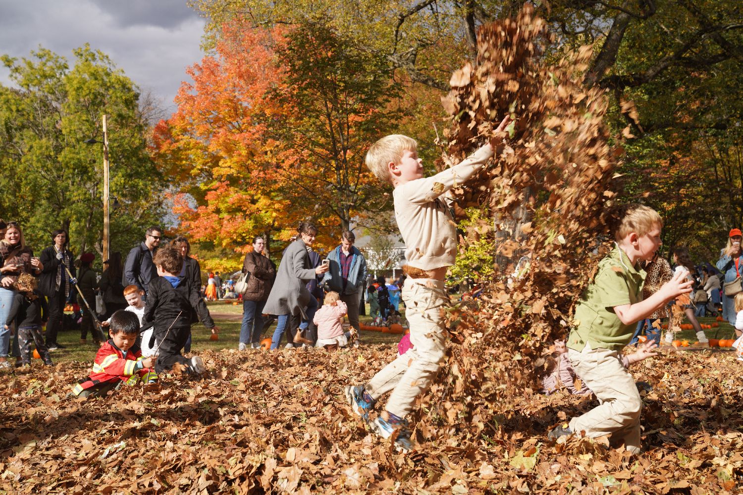 10月25日,在美国纽约总督岛,儿童在落叶中玩耍。(图片来源:本文图片均据新华社)