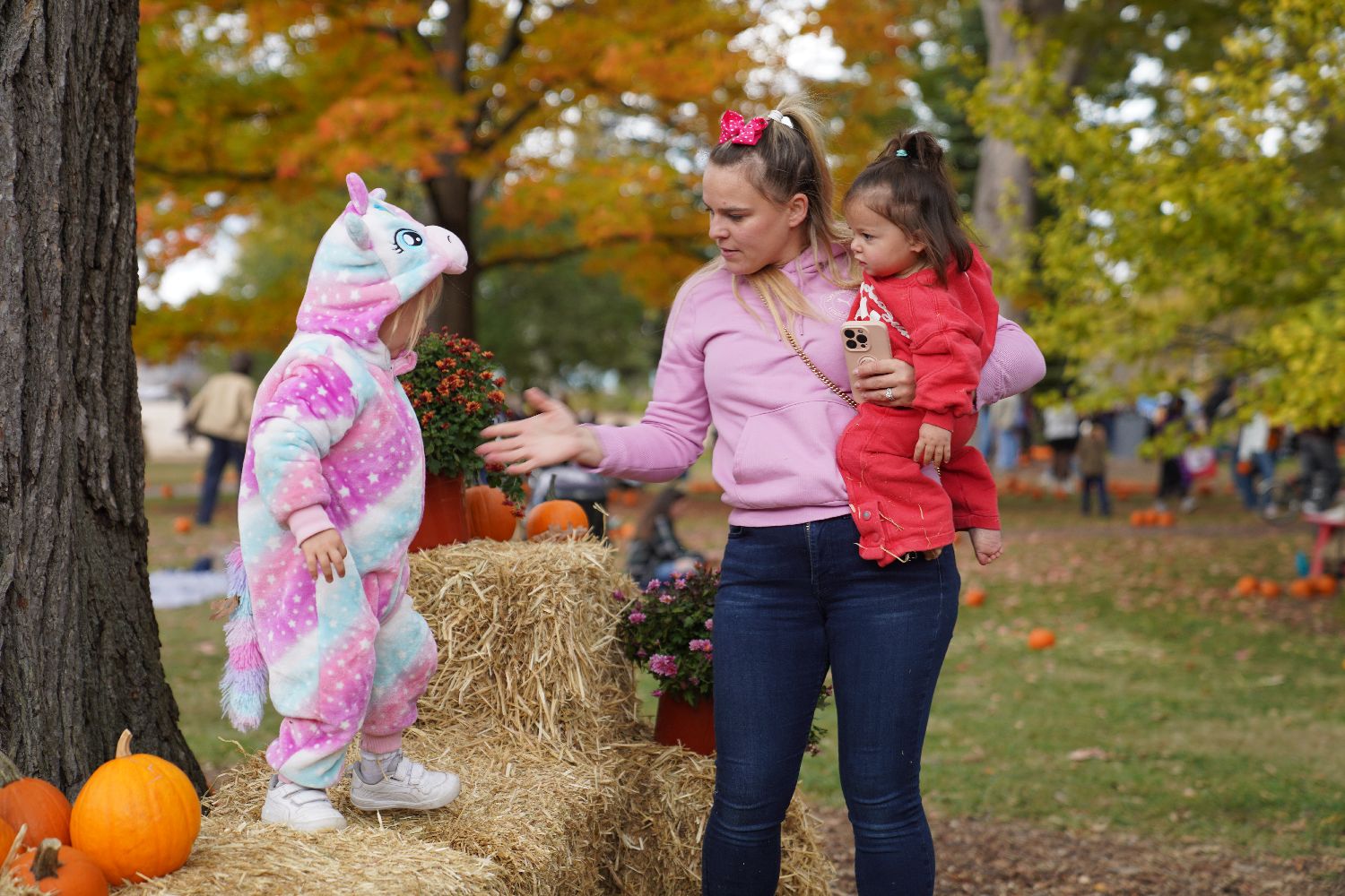 10月25日,在美国纽约总督岛,一名女子带着孩子参加秋日节。