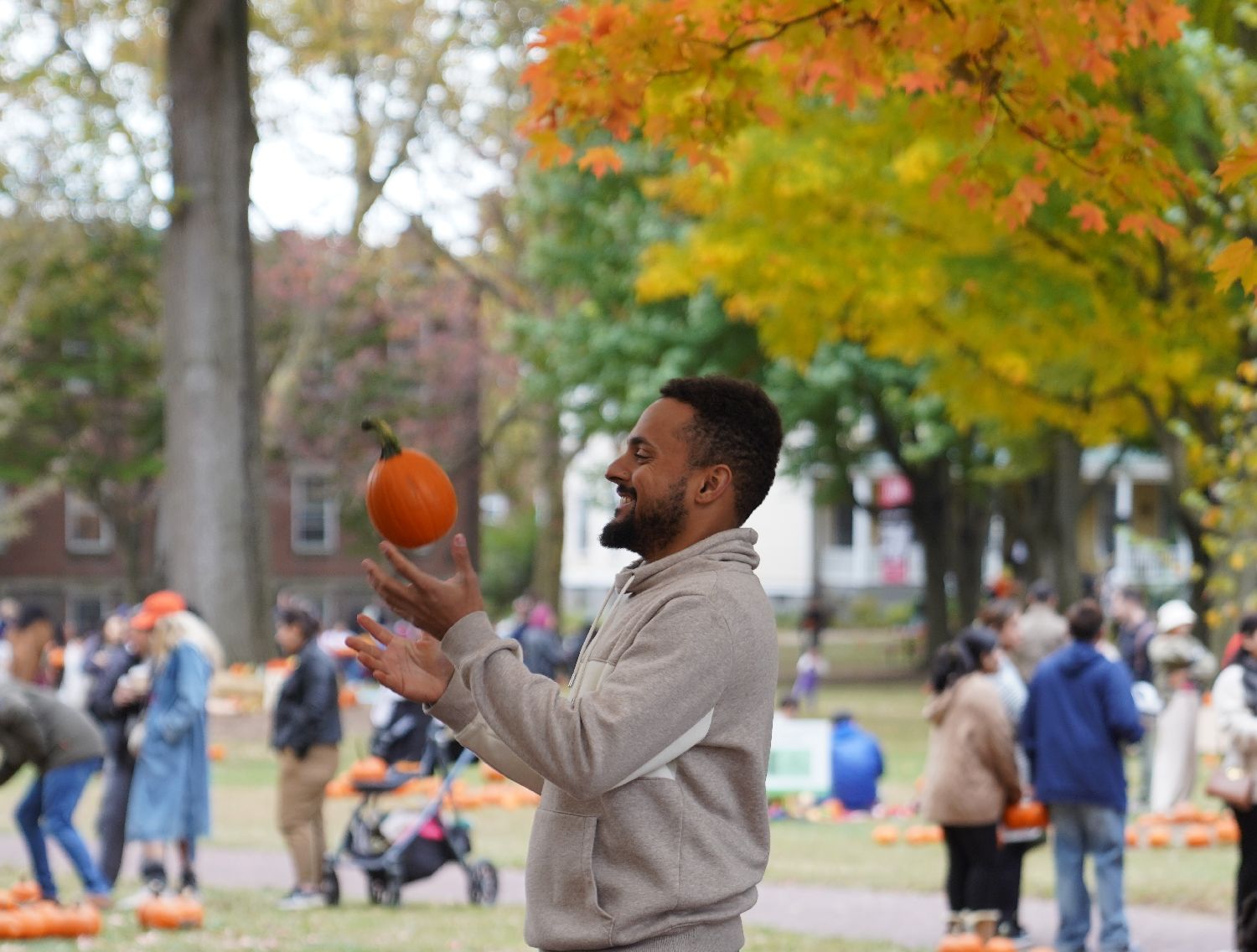 10月25日,在美国纽约总督岛,一名游人抛起一个金色南瓜。