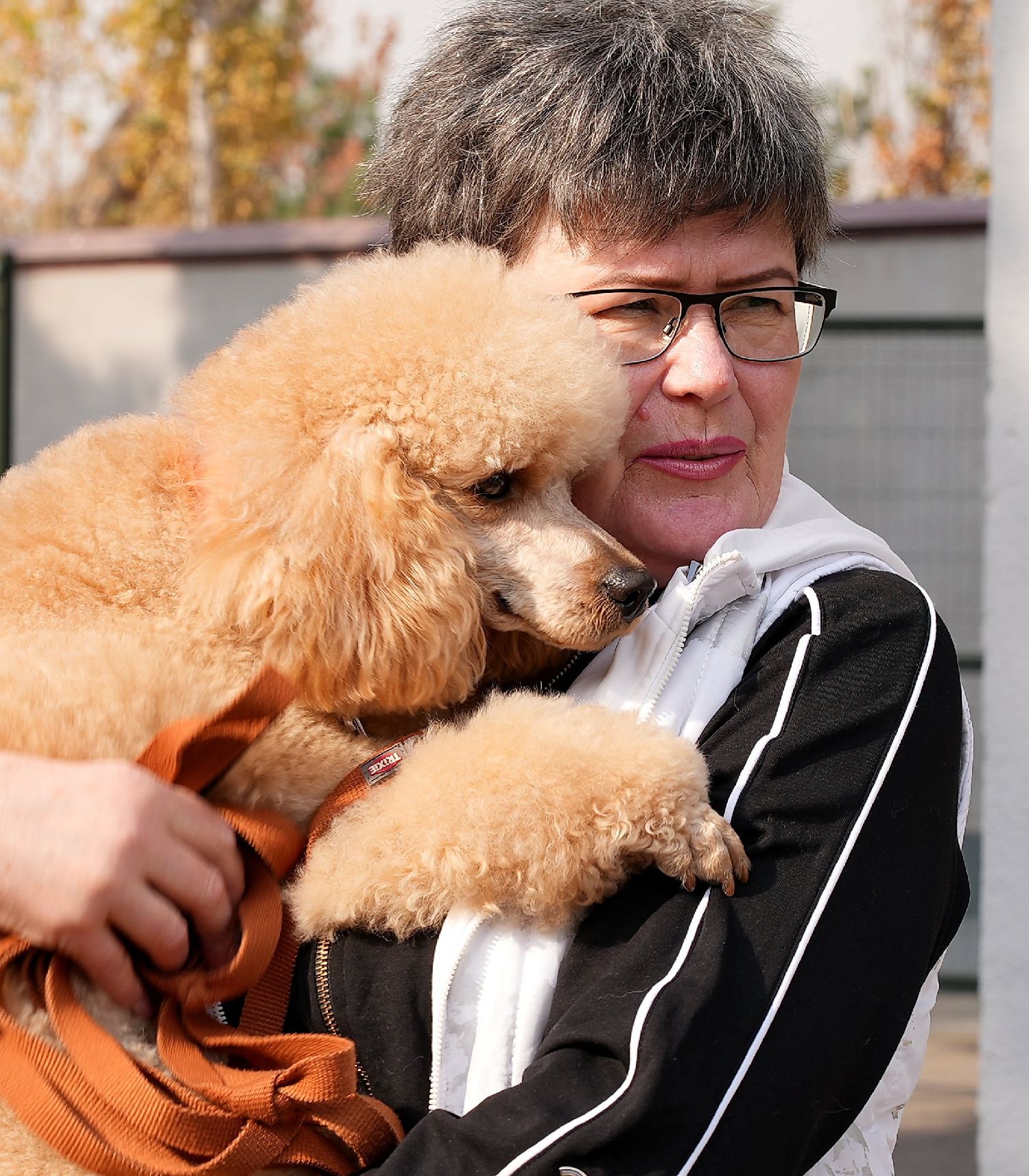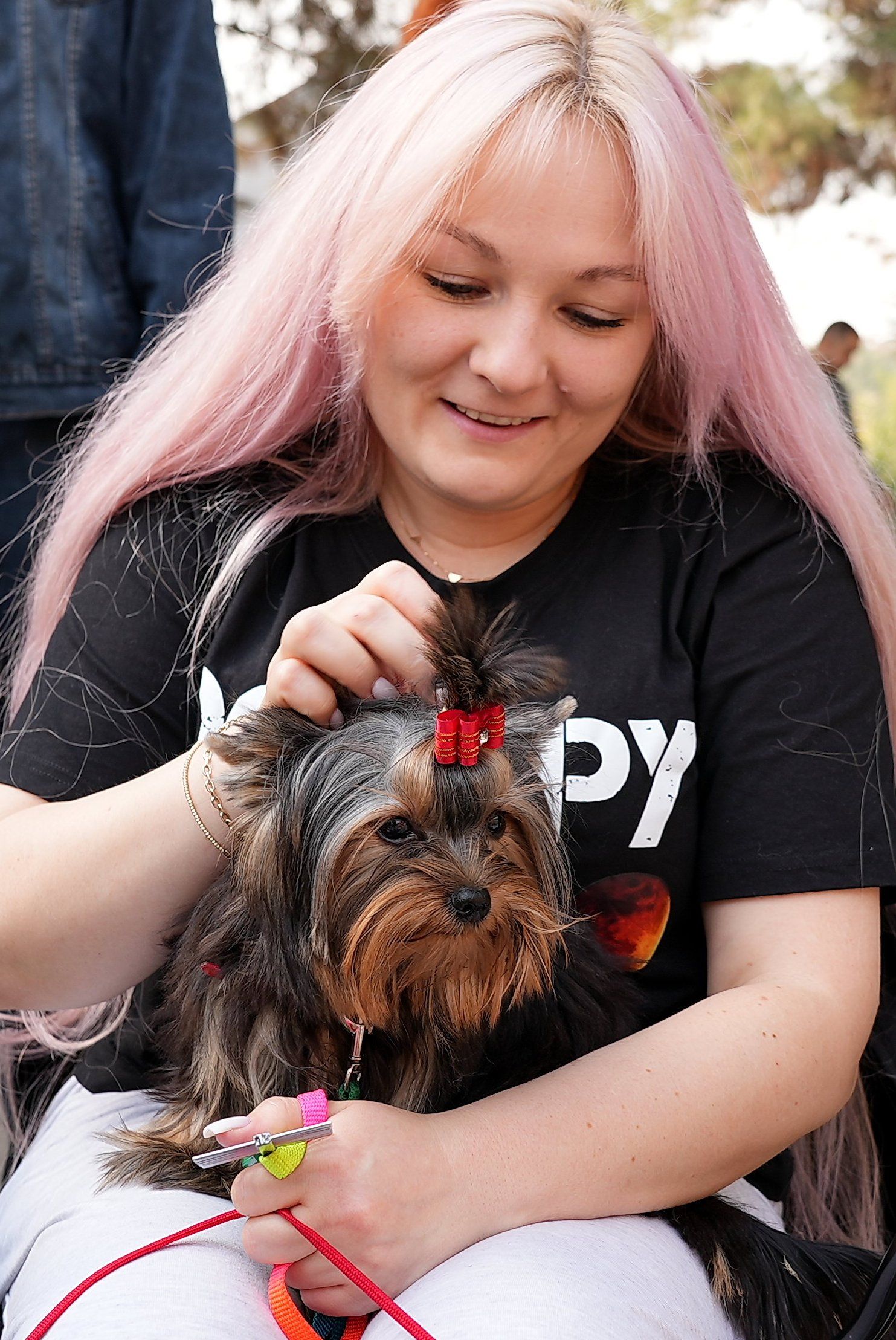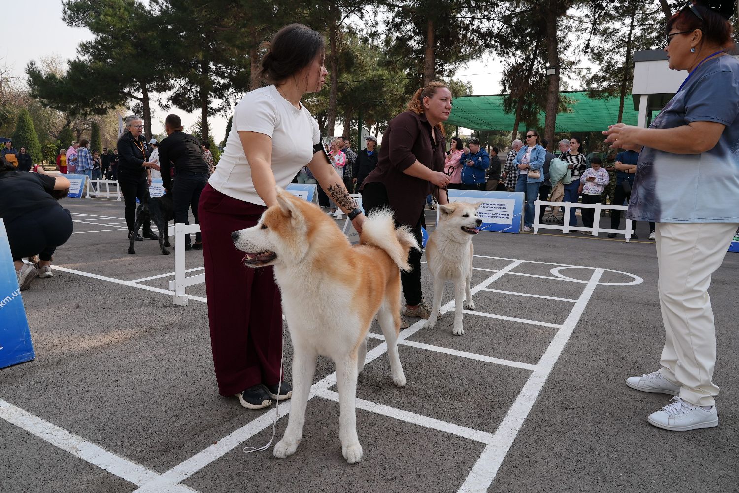 10月26日,在乌兹别克斯坦首都塔什干,当地居民在犬展上与狗狗互动。