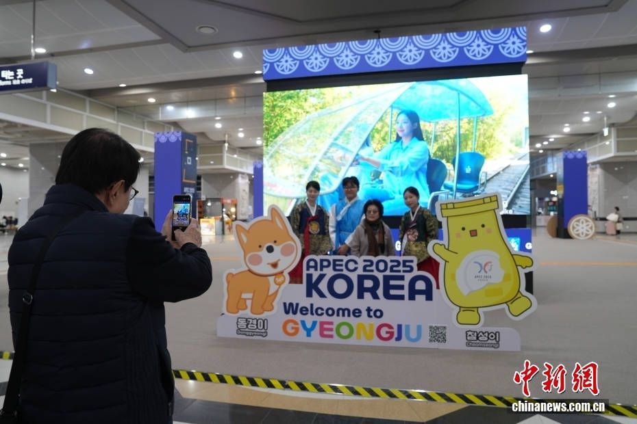 当地时间10月27日,人们在庆州火车站内APEC主题打卡点拍照留念。(图片来源:中新网)