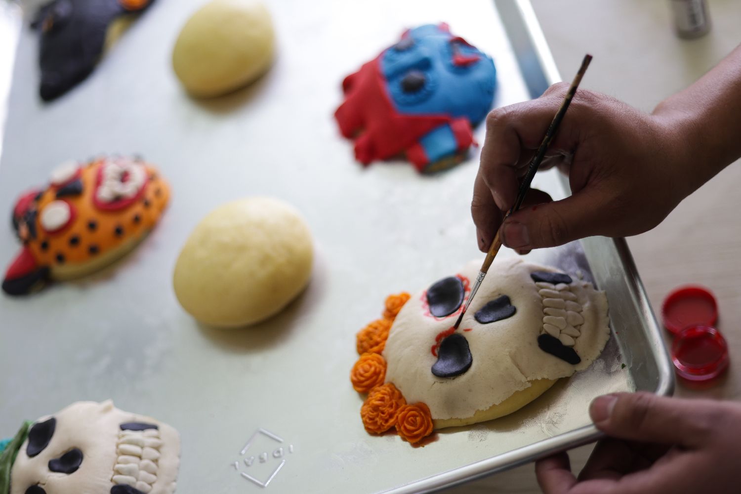 10月27日,在墨西哥首都墨西哥城的一家面包房,面包师制作“亡灵面包”。