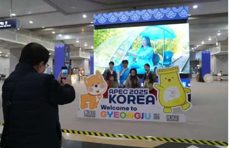 当地时间10月27日,人们在庆州火车站内APEC主题打卡点拍照留念。