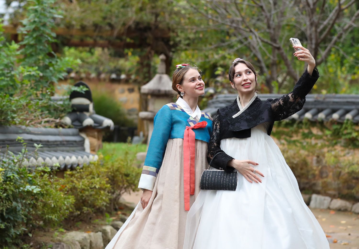 游客在韩国庆州保留朝鲜时代原貌的古村良洞村参观。