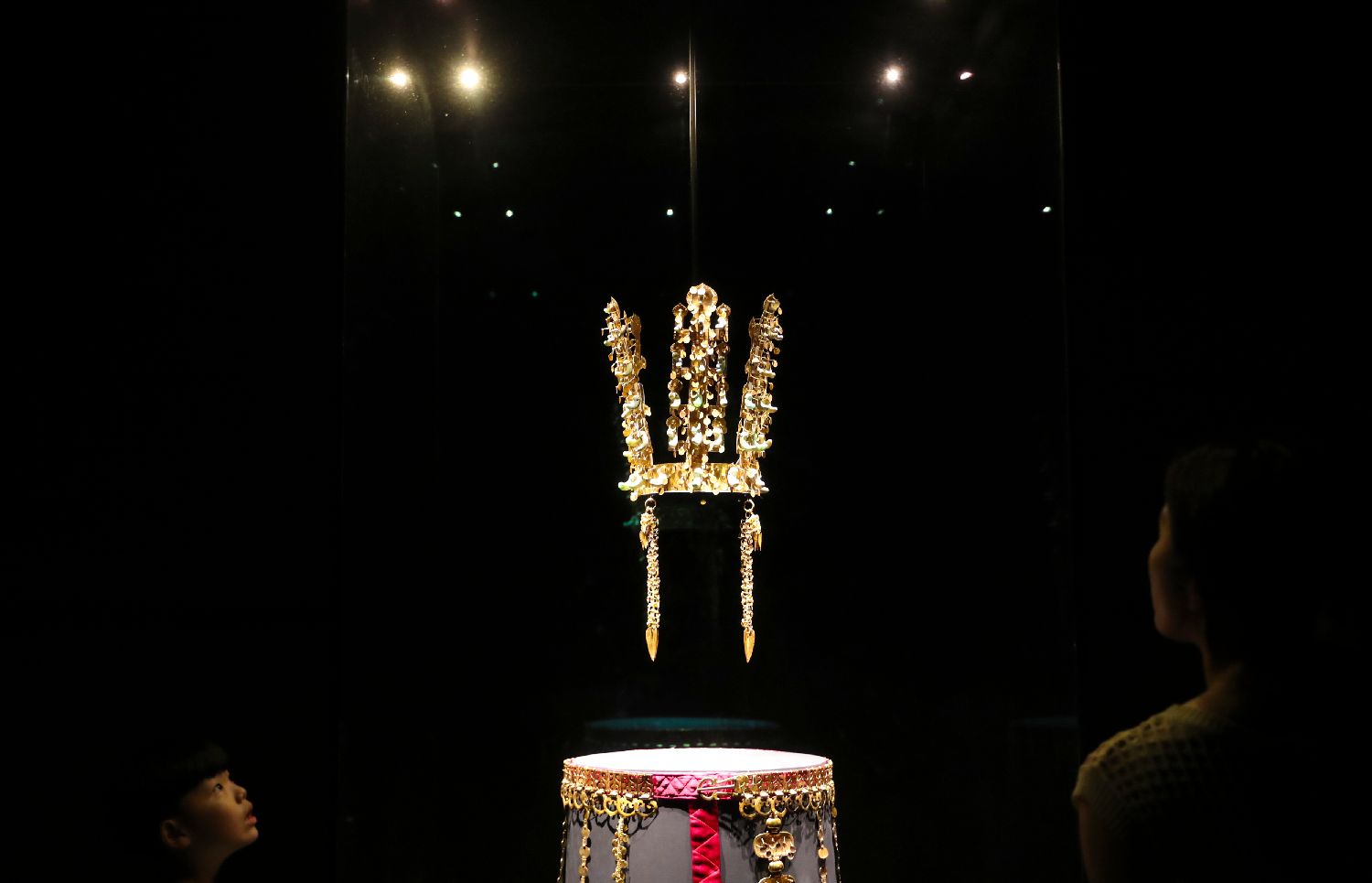 游客在韩国庆州博物馆参观新罗时代的文物金冠。