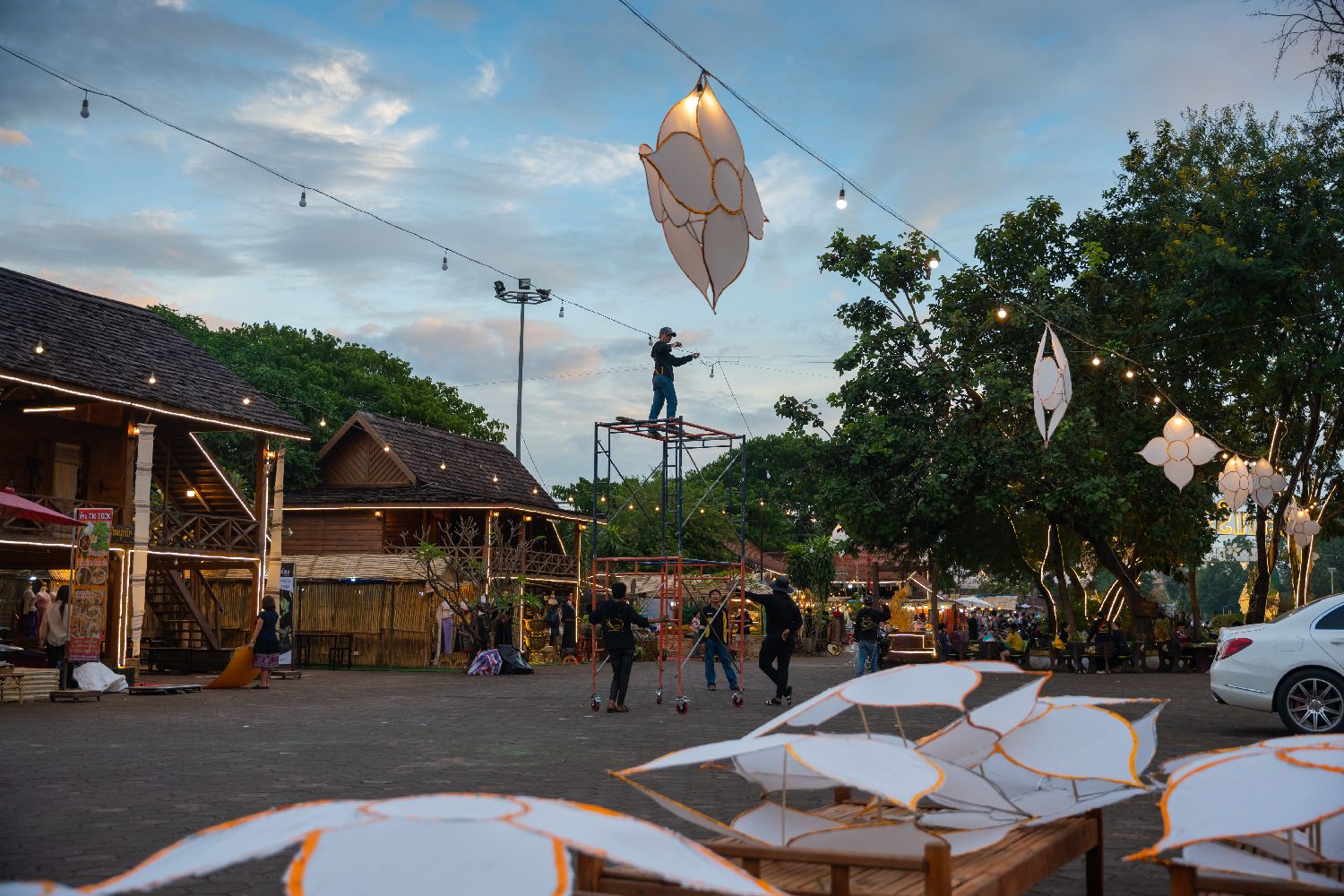 10月30日,在老挝首都万象,工作人员悬挂节日装饰灯。