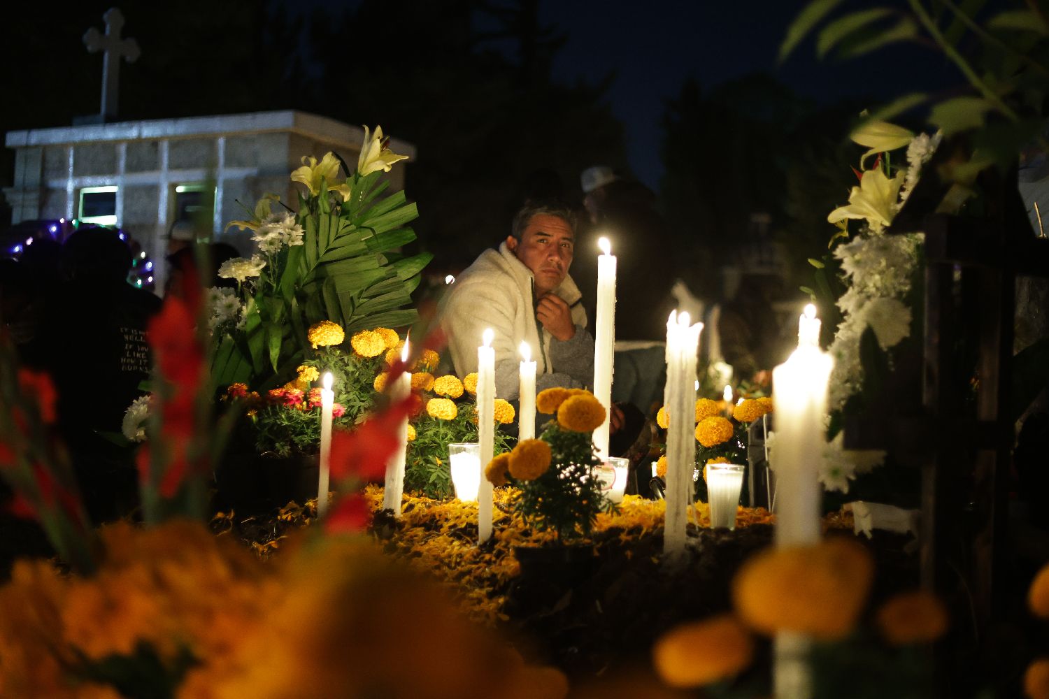 当地时间11月2日凌晨,在墨西哥首都墨西哥城,一名男子在墓地守夜,缅怀逝去的亲朋好友。