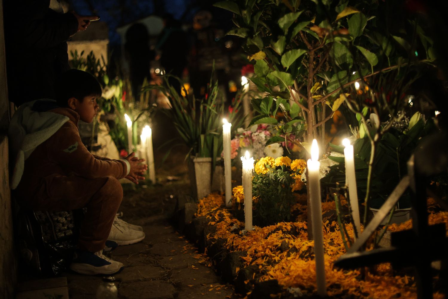 当地时间11月2日凌晨,在墨西哥首都墨西哥城,一名儿童在墓地守夜,缅怀逝去的亲朋好友。
