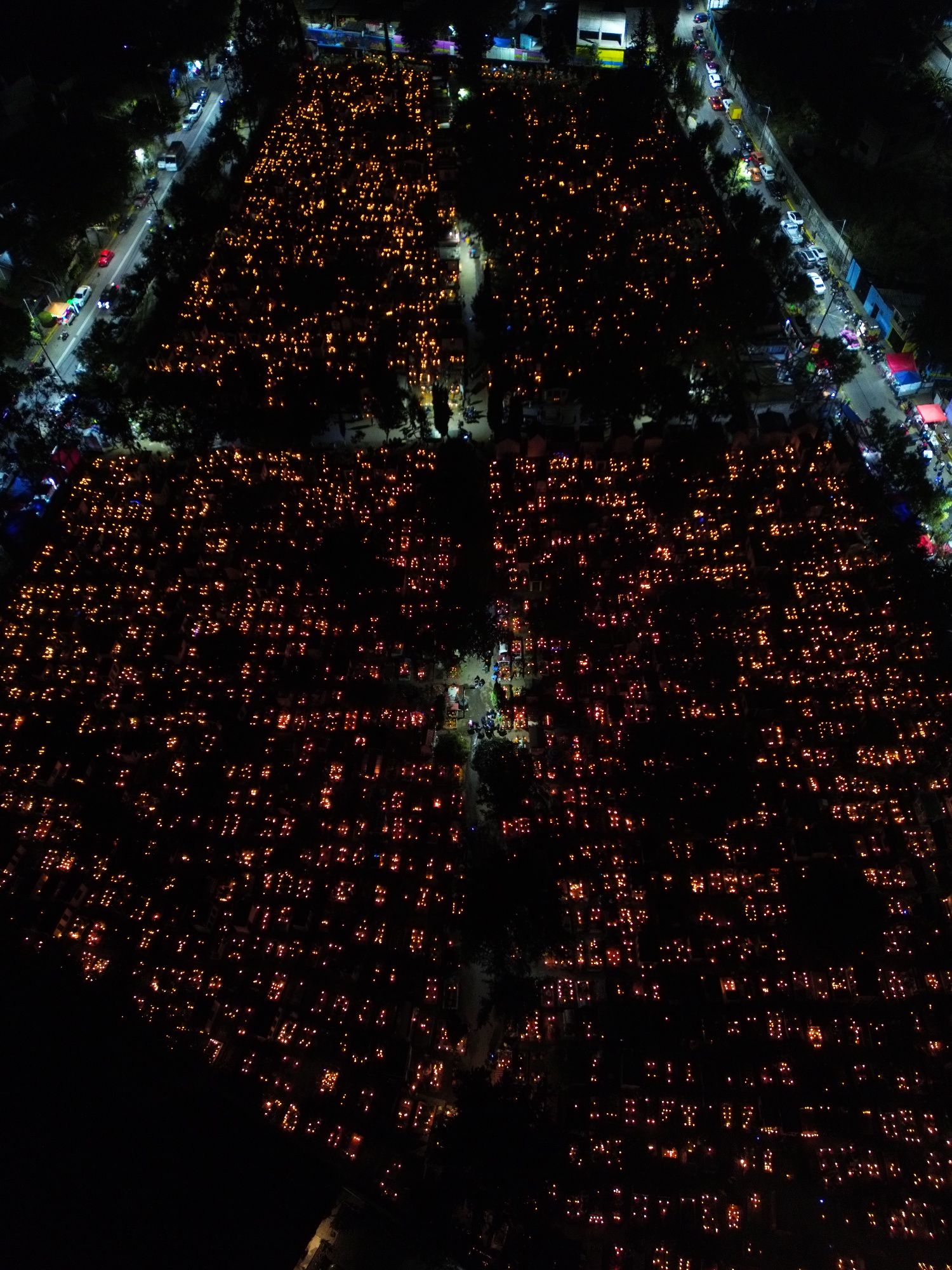 每年的11月1日和2日是墨西哥的传统节日亡灵节。当地民众会前往墓地守夜,点燃蜡烛并献上万寿菊等鲜花,以悼念逝去的亲朋好友。