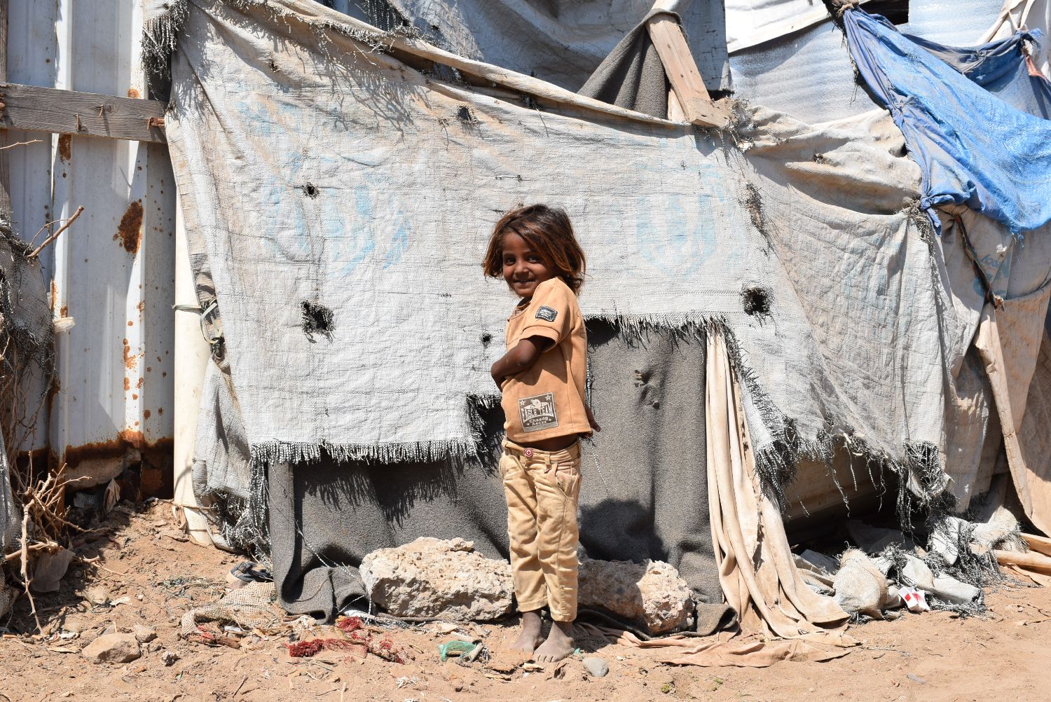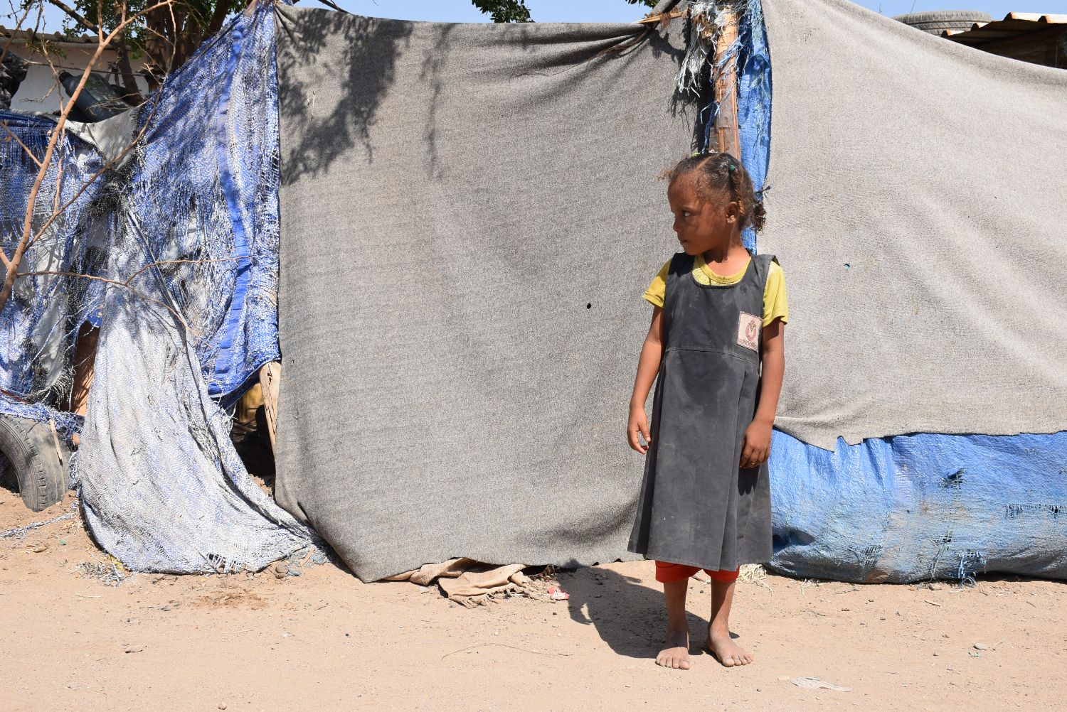 11月3日,在也门南部城市亚丁郊区,一名女孩站在自家帐篷外。