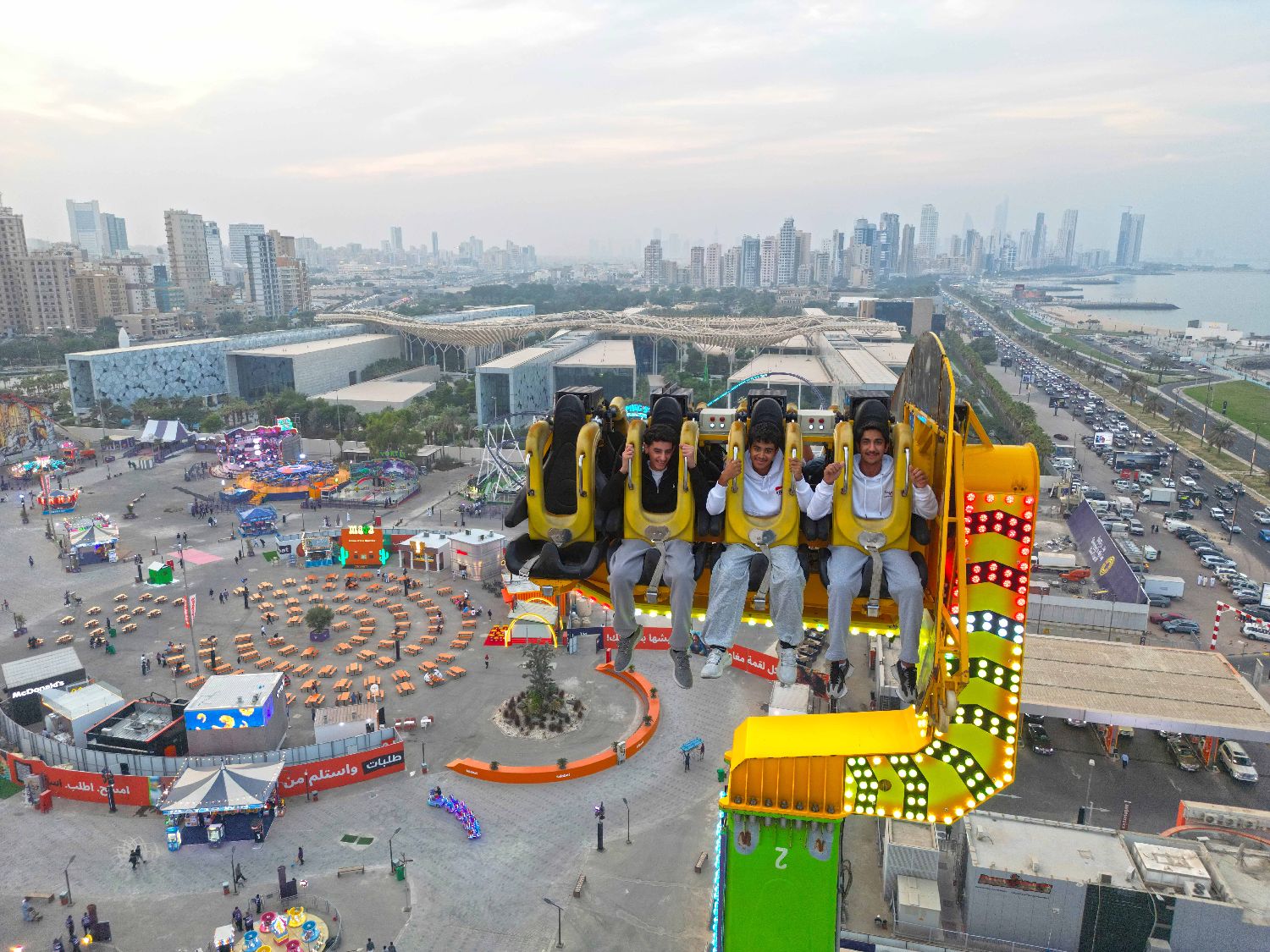11月6日,人们在“科威特冬日仙境”游乐园内体验游乐项目(无人机照片)。