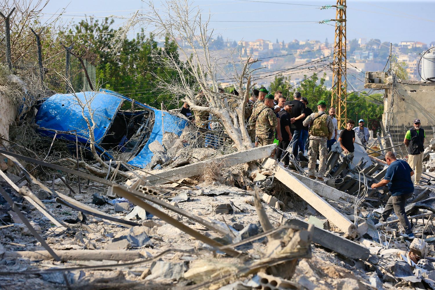 11月6日,在黎巴嫩南部城市提尔的阿巴西耶镇,黎巴嫩民众和军人查看以色列空袭现场。